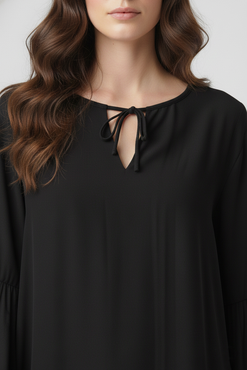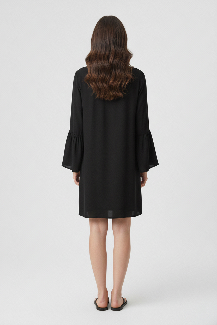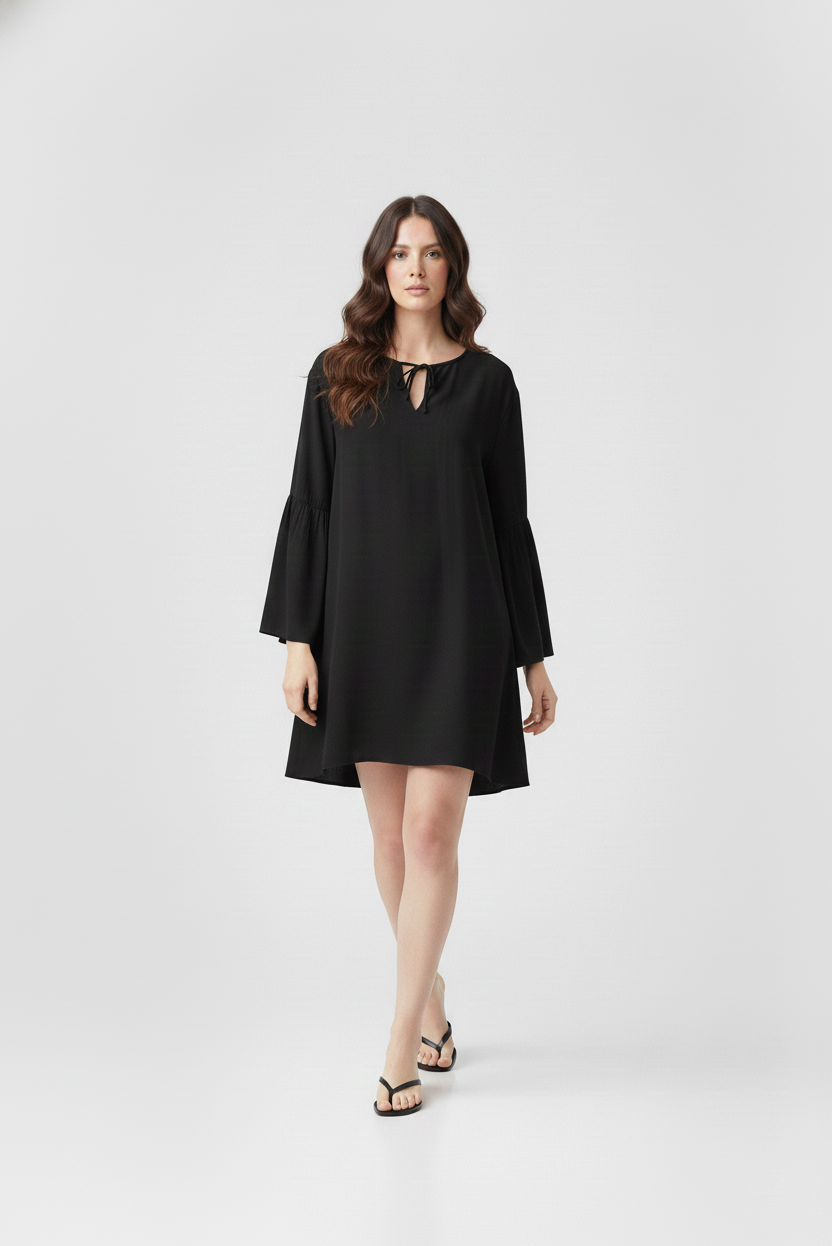 Vestido fit holgado, escote redondo con tajo en V y lazos del mismo textil. Posee manga 3/4 con volados en forma acampanada y tajo sobre la misma.Tiene un largo modular por encima de las rodillas. Confeccionado en 100% viscosa. Un ítem que se caracteriza por el movimiento que le otorga su textura liviana.