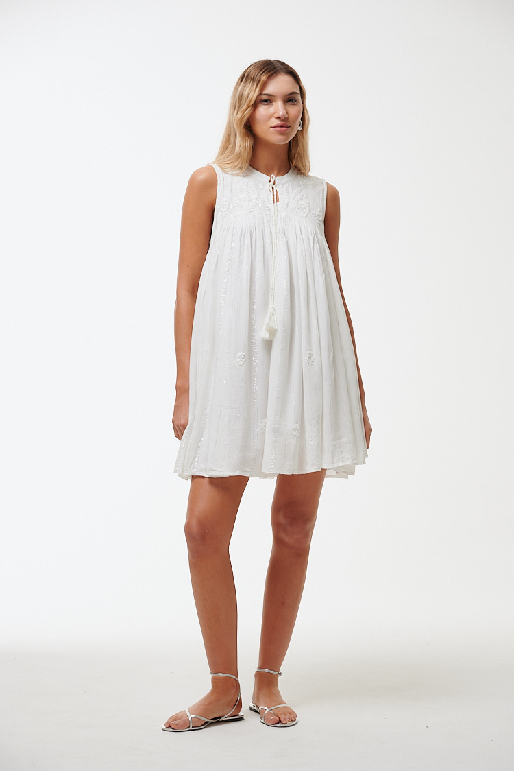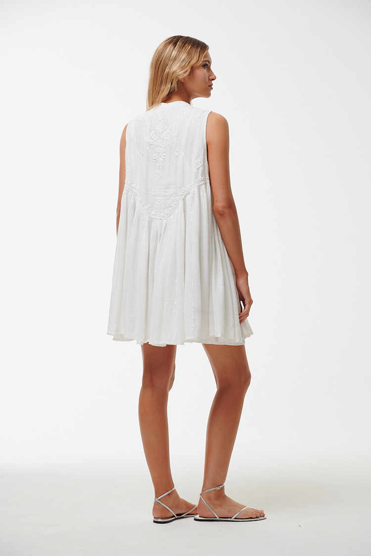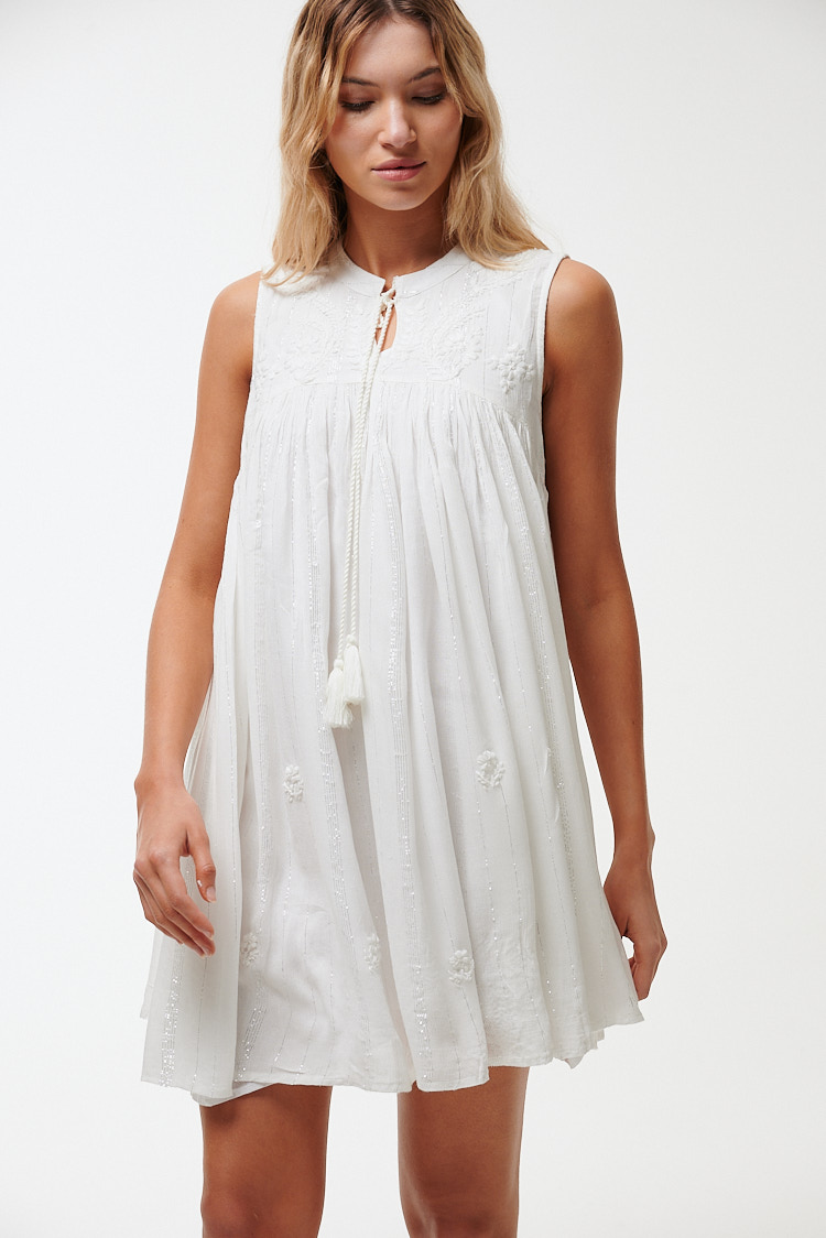 Vestido corto, de corte trapecio y calce holgado. Esta confeccionado en hilo de algodón, con delicado detalles de bordados florales e hilos color plata que le otorgan un aire romántico. Posee cuello redondo cerrado, con pequeña abertura en el pecho y cordones con borlas en los extremos, sin mangas y pinzas en todo el contorno para dar vuelo y movimiento a la prenda. Su largo es por encima de las rodillas.
