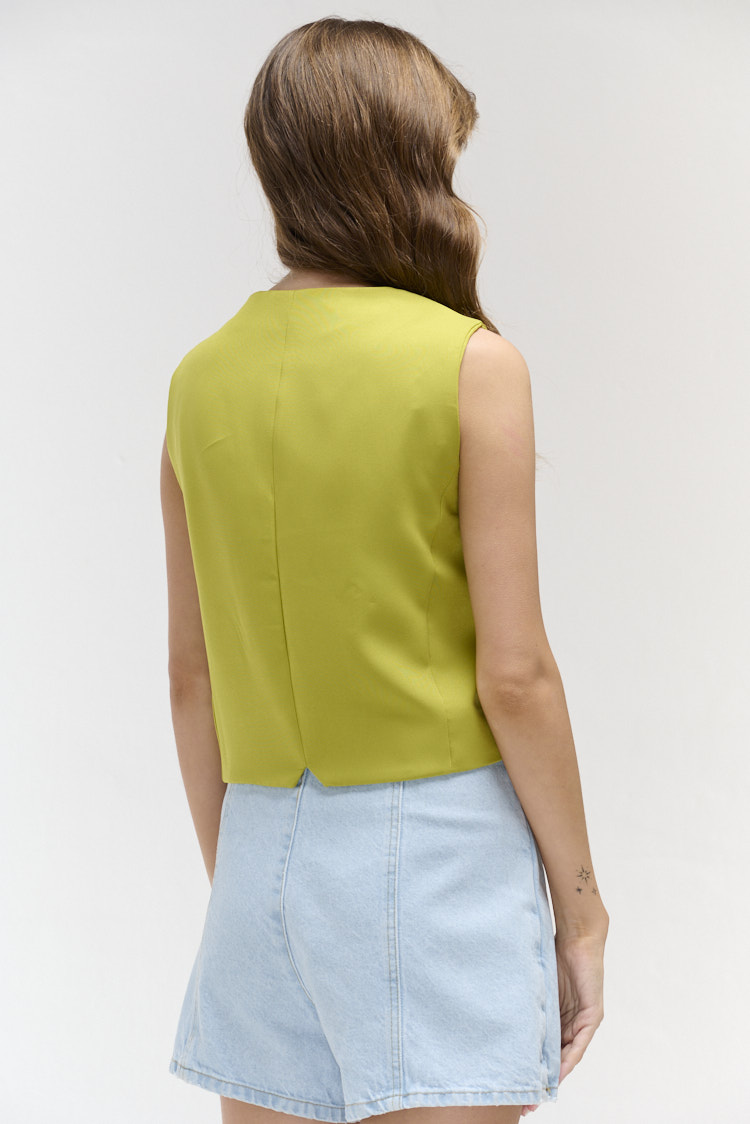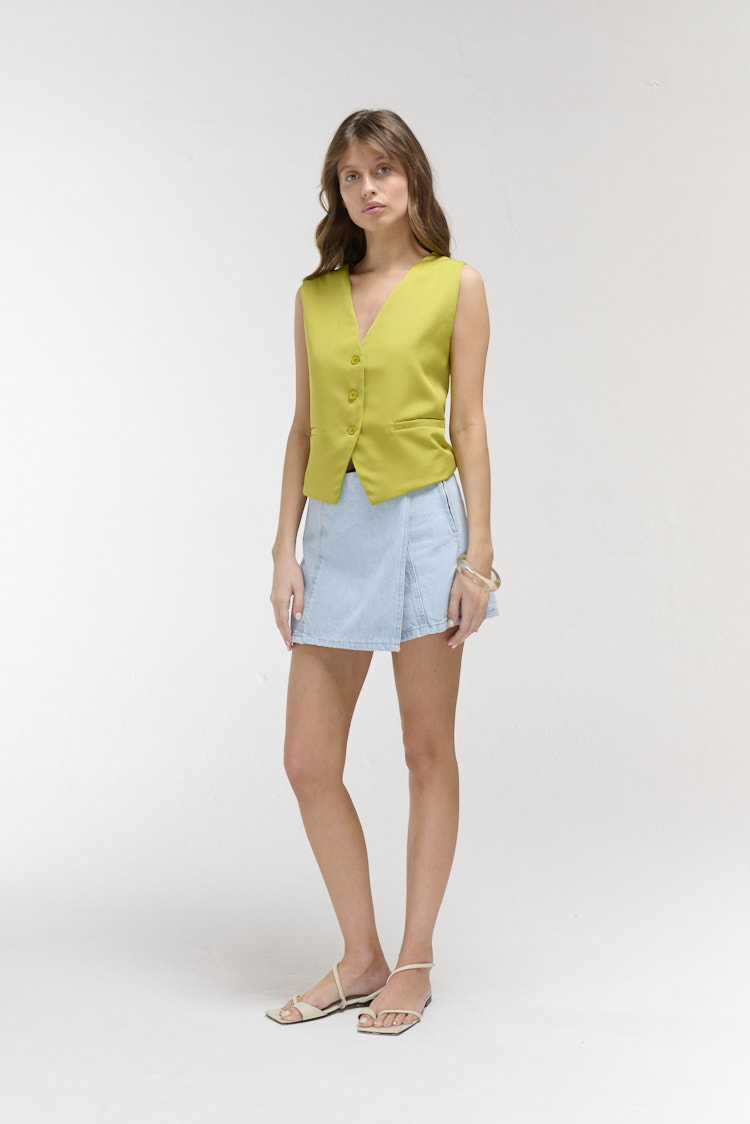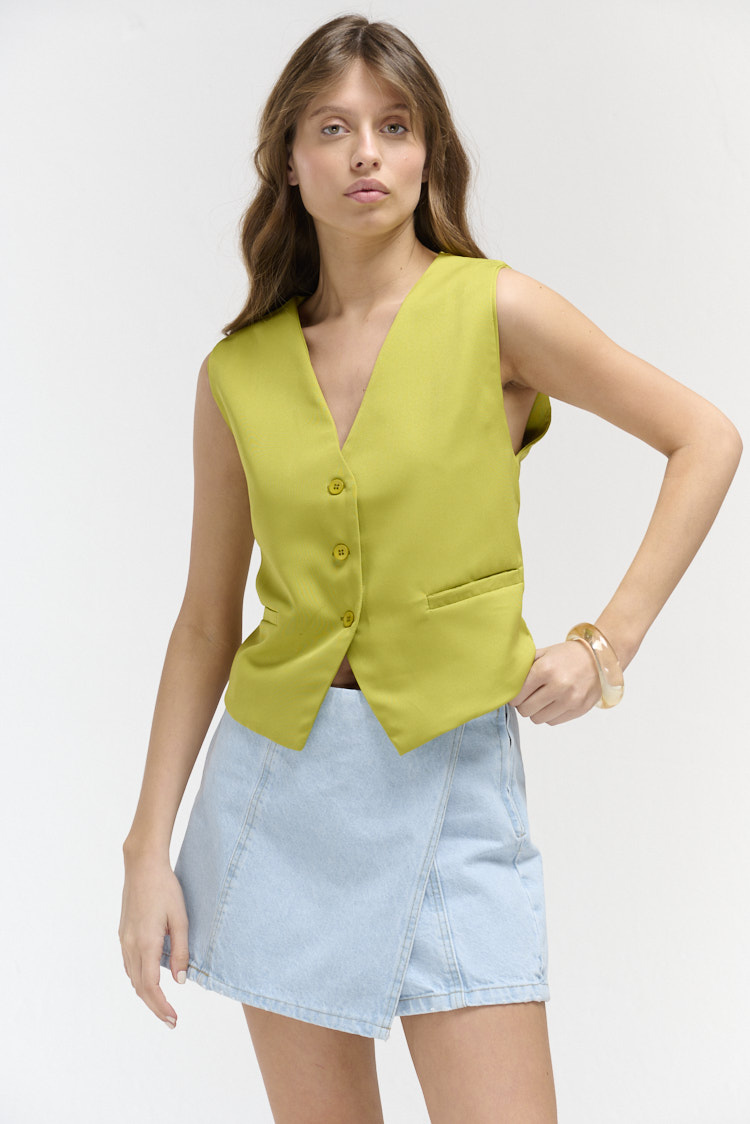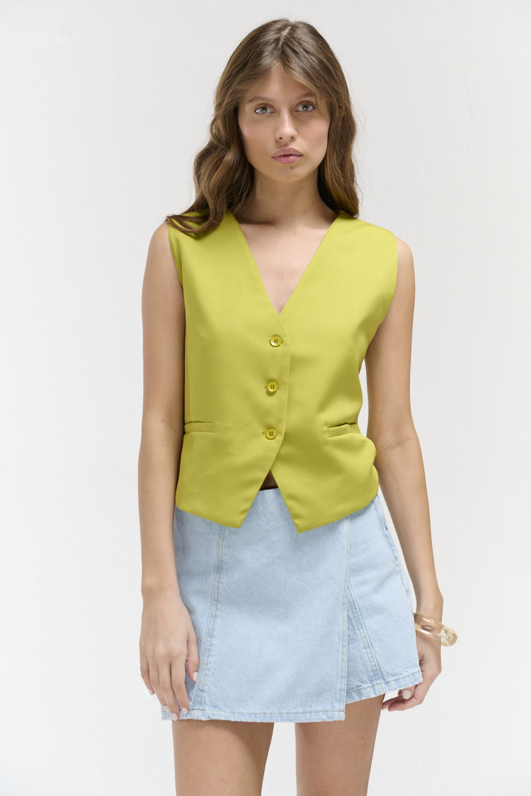 Chaleco abotonado con largo modular a la cintura, su terminación es en picos y posee dos bolsillos de fantasía a sus laterales