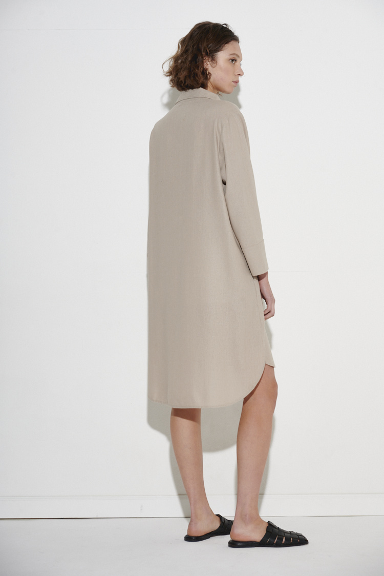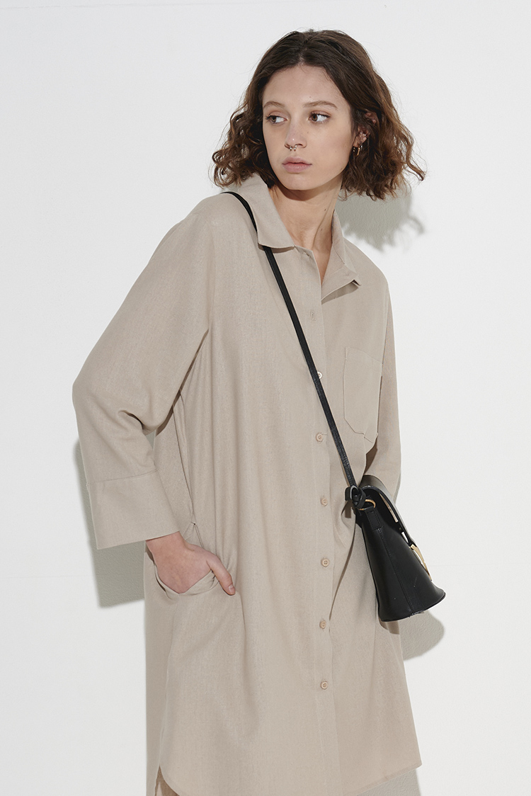 Camisola larga, lisa, de corte recto y calce holgado. Está confeccionada en popelina de algodón y fibras sintéticas, una tela liviana y resistente a las arrugas. Posee cuello camisero, mangas largas, 1 bolsillo delantero y 2 bolsillos laterales y botones frontales. Su largo es asimétrico, más largo en la parte trasera, con terminación redondeada.