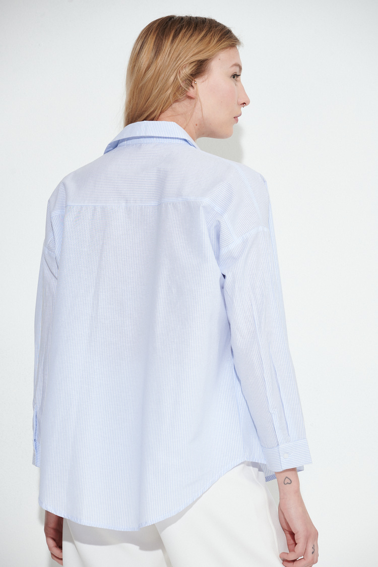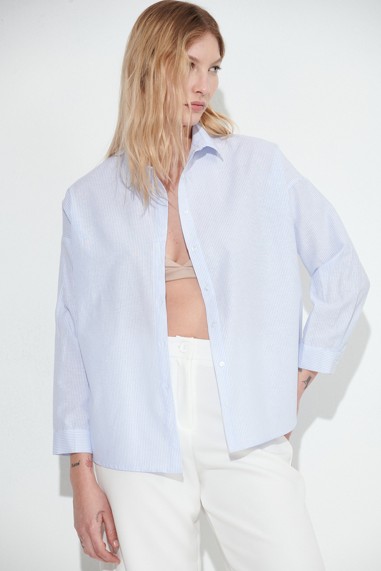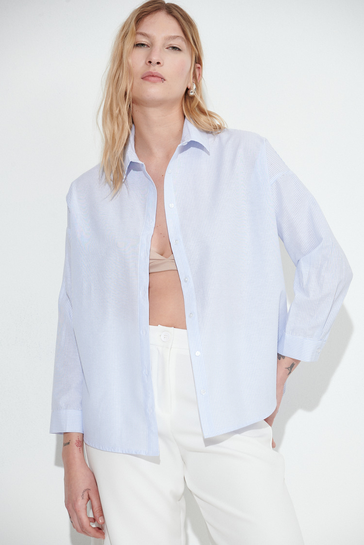 Camisa clásica, a rayas finas en forma vertical, de corte recto y calce holgado. Está confeccionada en popelina. Posee cuello camisero, mangas largas con hombro caído y botones frontales. Su largo es a la altura de la cadera, con terminación redondeada.