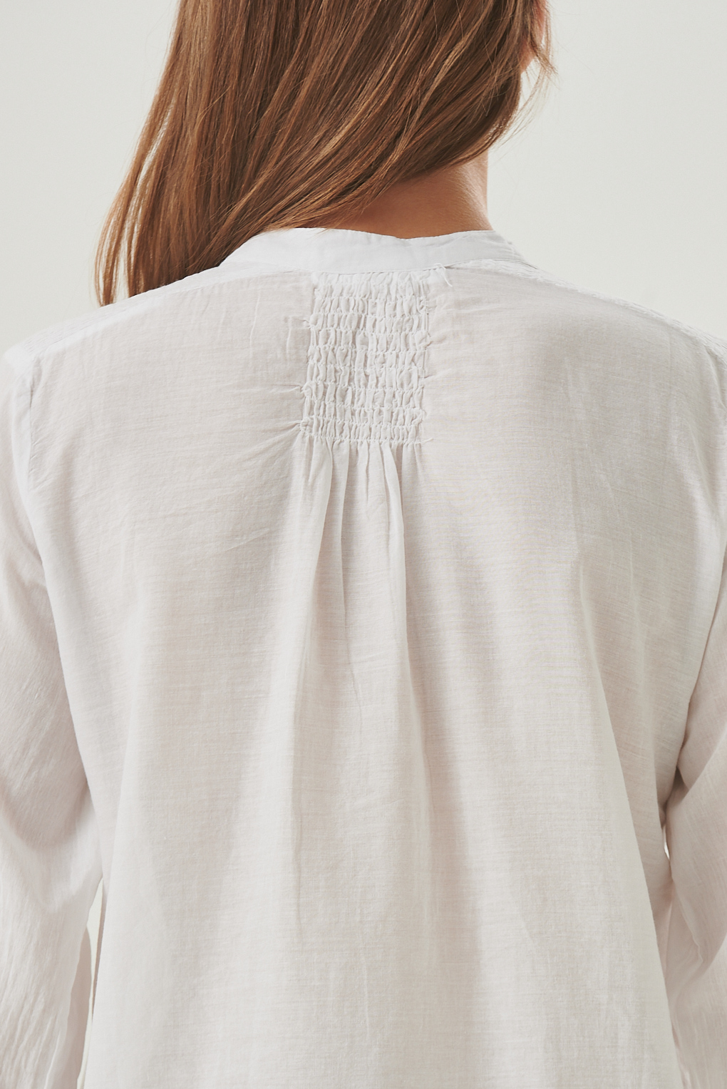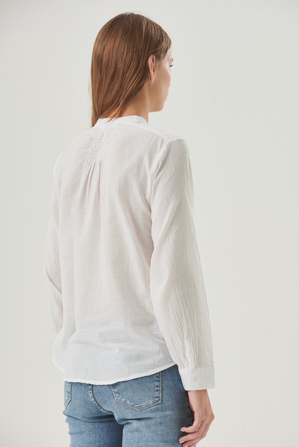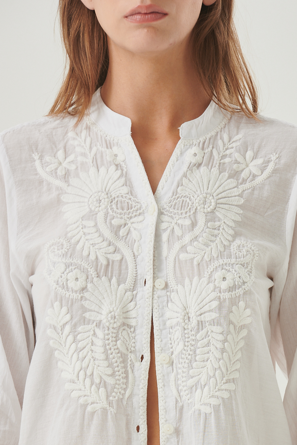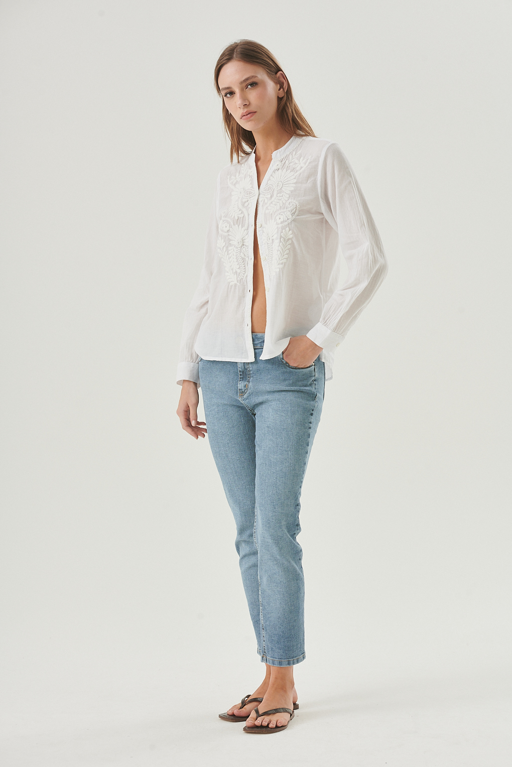 Confeccionada en algodón 100% con un cuello estilo mao que aporta un toque moderno y minimalista, esta prenda destaca por su delicado bordado en el frente, añadiendo un detalle femenino y encantador. Su largo hasta la cadera ofrece un ajuste cómodo y versátil, ideal para usar por dentro o por fuera de pantalones o faldas. Perfecta para crear looks casuales con estilo o para ocasiones más formales.