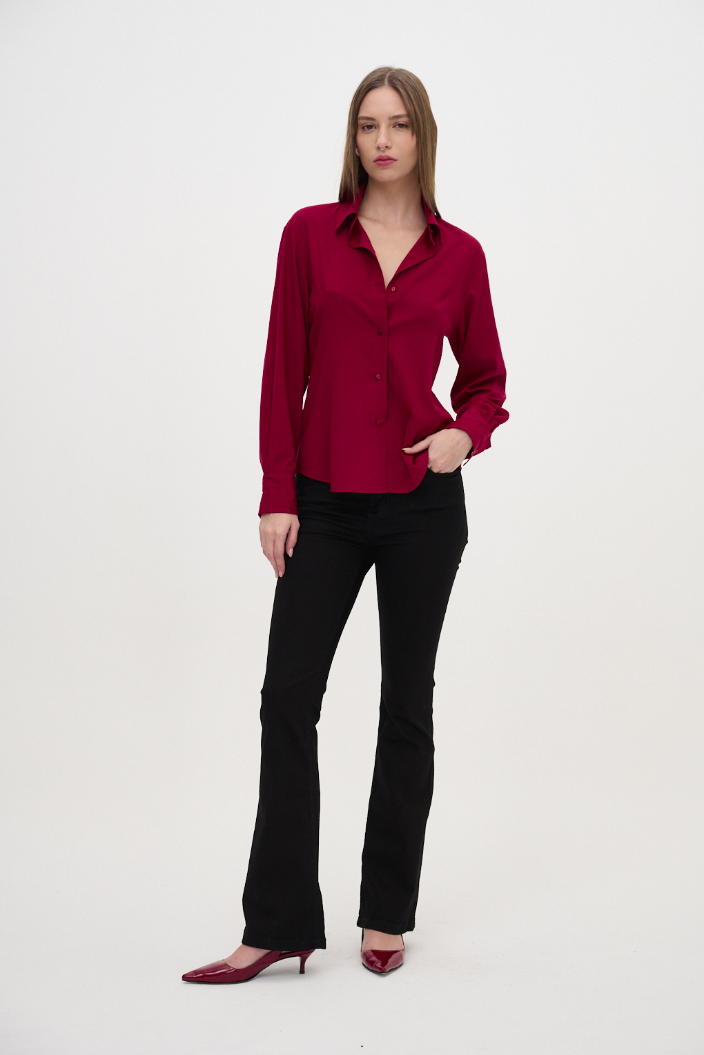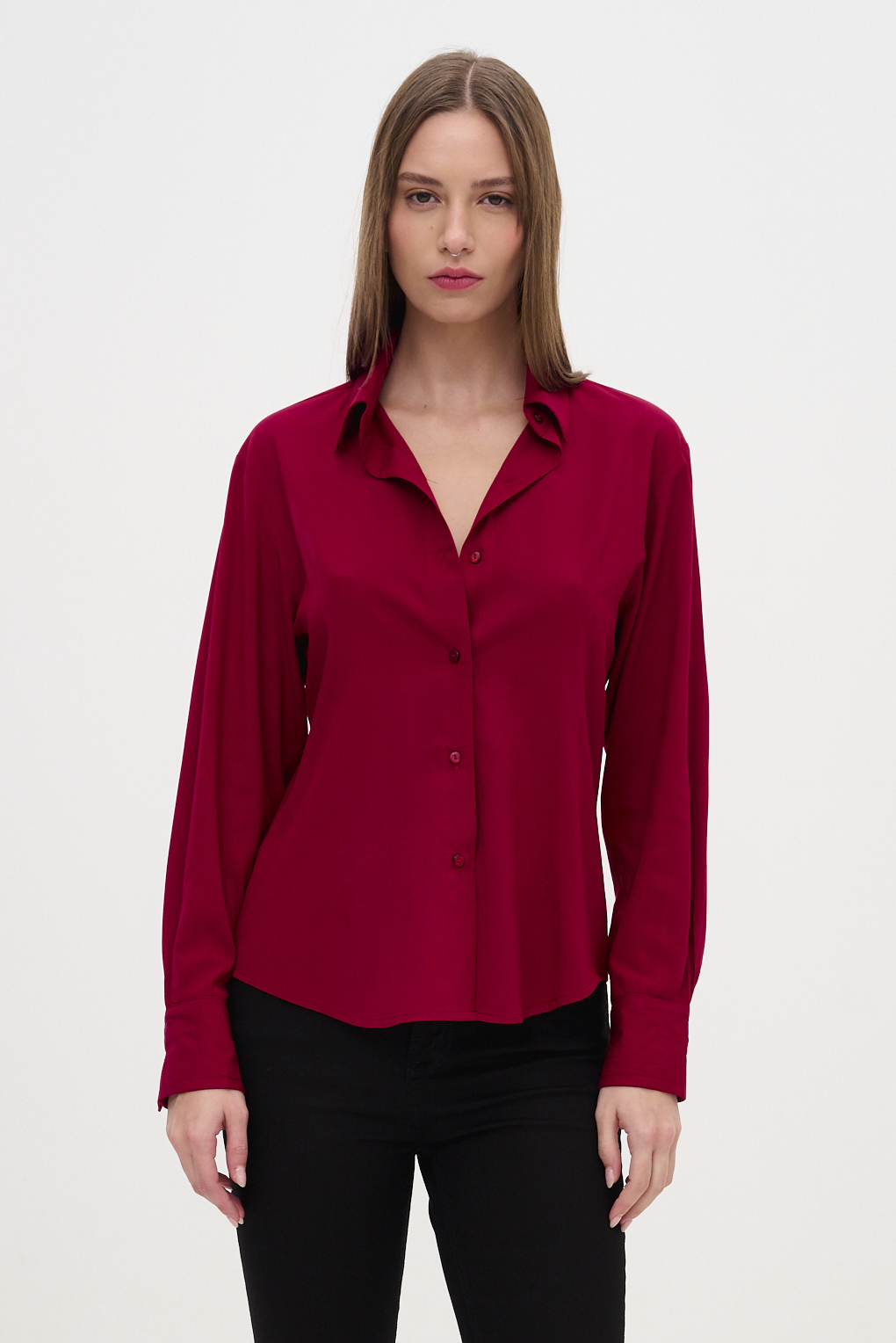 Esta camisa básica de poplin está diseñada para quienes buscan una prenda atemporal con detalles que realzan la silueta. Confeccionada en poplin, su textura suave y firme le aporta una caída estructurada y prolija, ideal tanto para looks formales como casuales. Incorpora pequeñas pinzas frontales que generan un sutil entalle, definiendo la figura sin ajustar. Este detalle le da un toque de sofisticación al clásico diseño recto, manteniendo la comodidad.