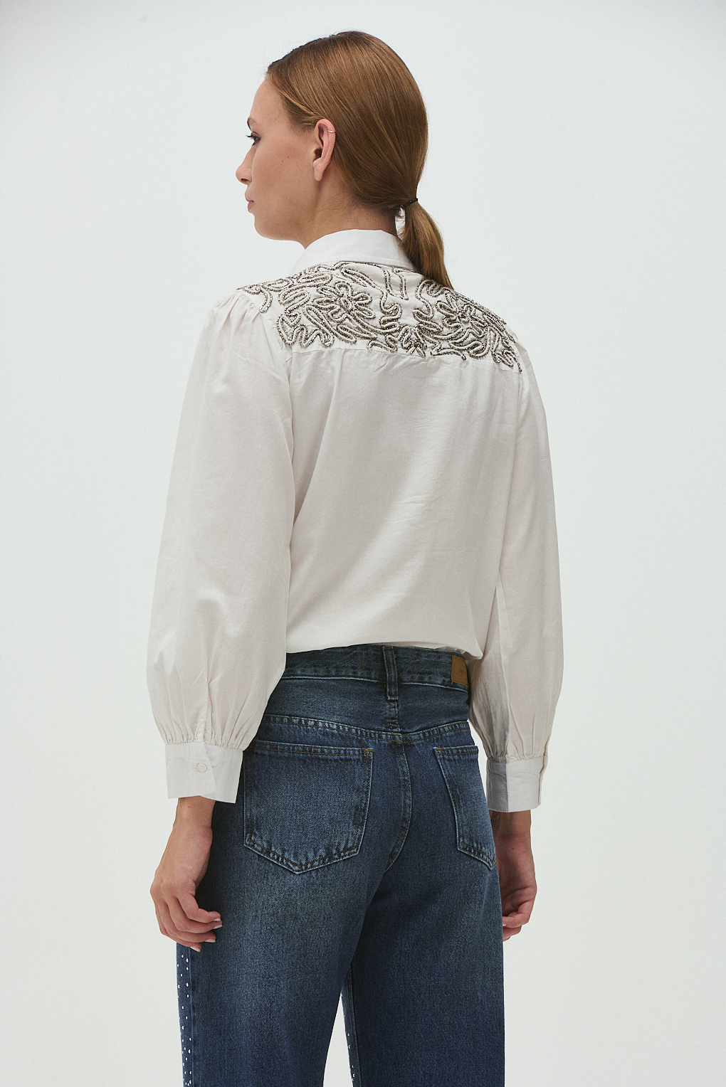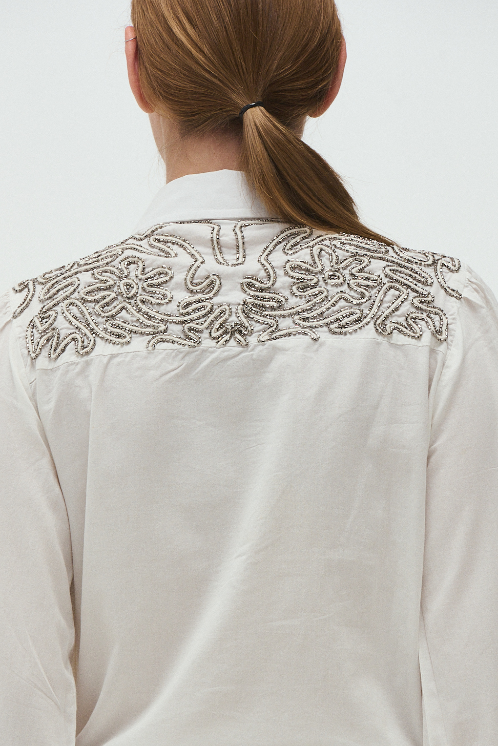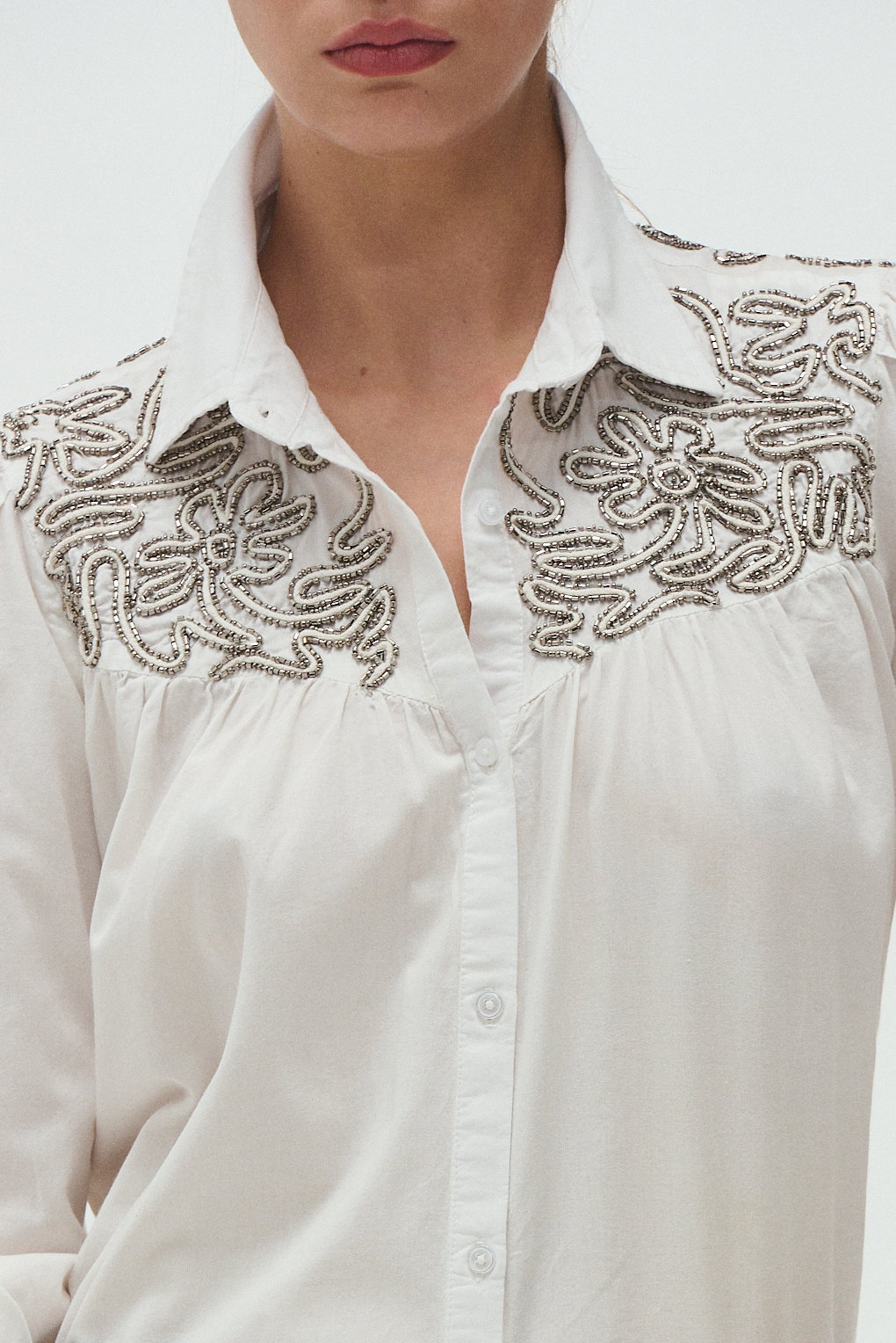 La camisa Magnolia Fresh está confeccionada en algodón. Su diseño destaca por el bordado con mostacillas metálicas tanto en el delantero como en la parte trasera, creando un efecto visual artesanal y elegante. Tiene mangas largas con frunce en el puño, cuello clásico y un corte relajado que la hace cómoda para usar todo el día.