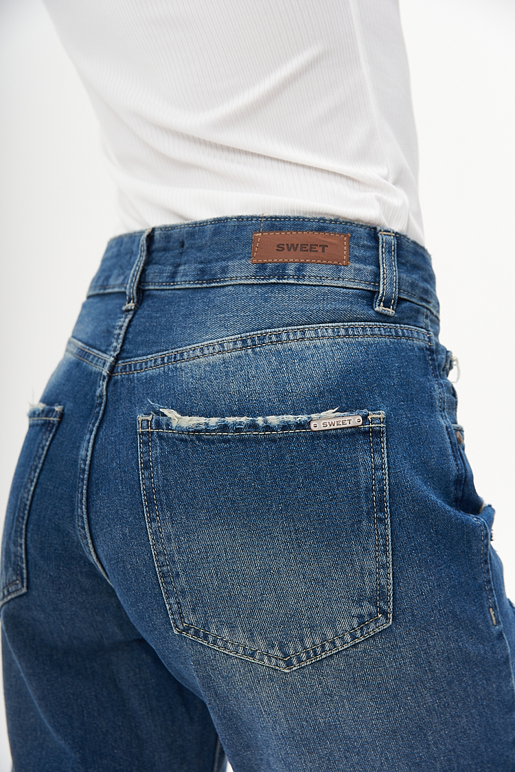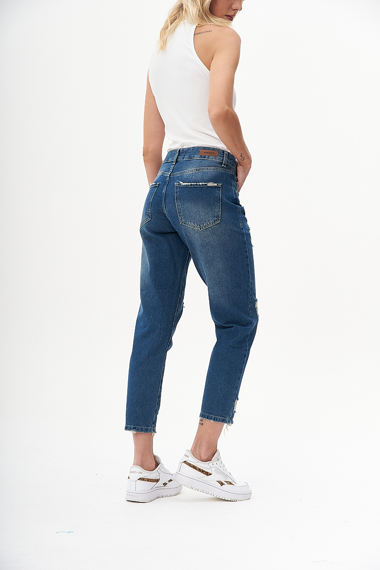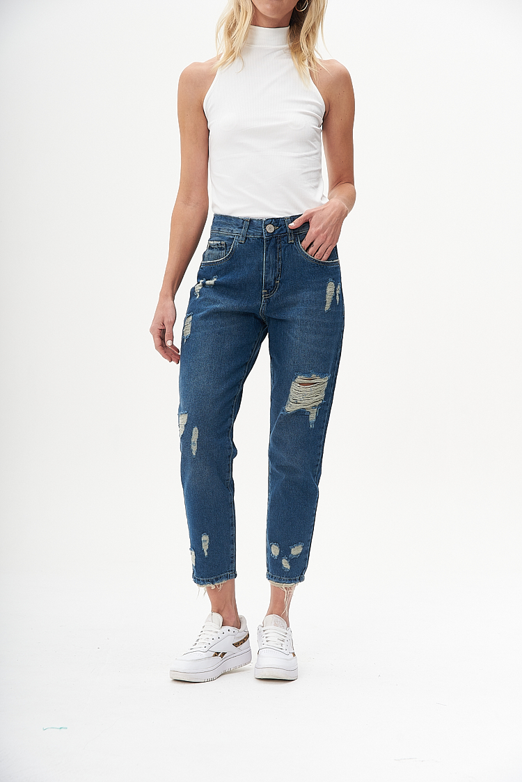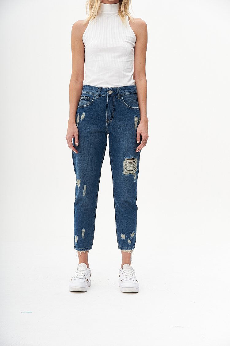 Clásico jean corte mom de calce rígido y tonalidad azul-verdoso con roturas en diferentes zonas de la parte delantera y bolsillos traseros. Aportándole originalidad. Posee cinco bolsillos. Es de tiro alto con pierna semi recta y su terminación tiene semi-rotura. Un modelo de nuestra línea denim ideal para cada estación del año.