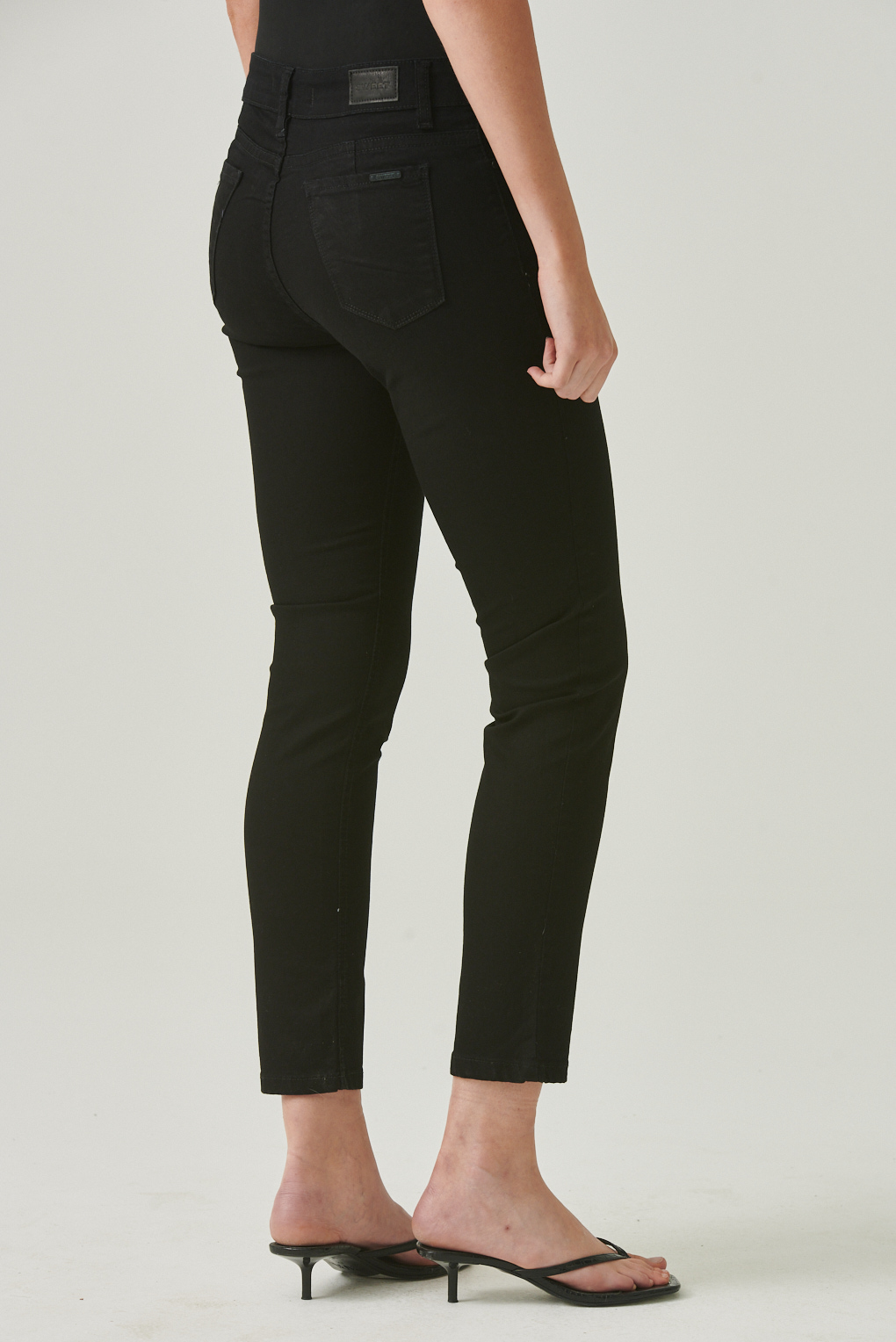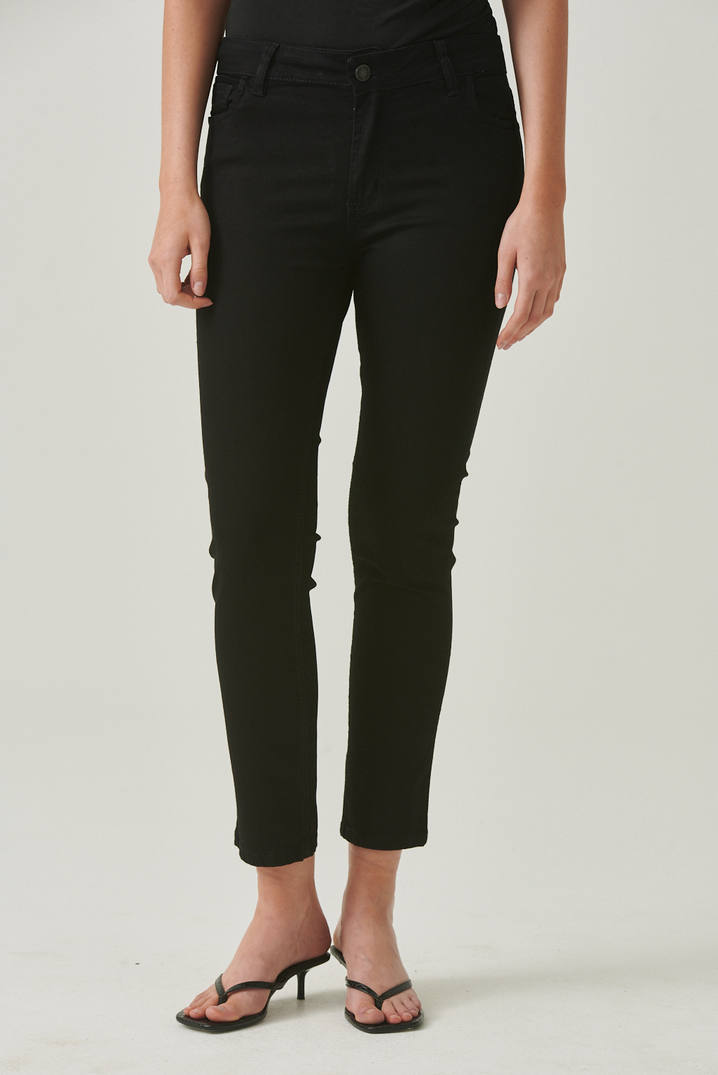 Pantalón denim skinny elastizado en color negro, de tiro medio. Con un ajuste perfecto que resalta la figura, ideal para un look moderno y cómodo, fácil de combinar con cualquier prenda superior.