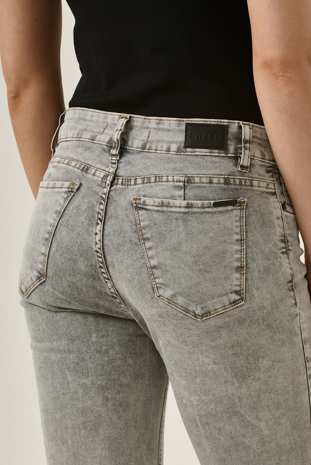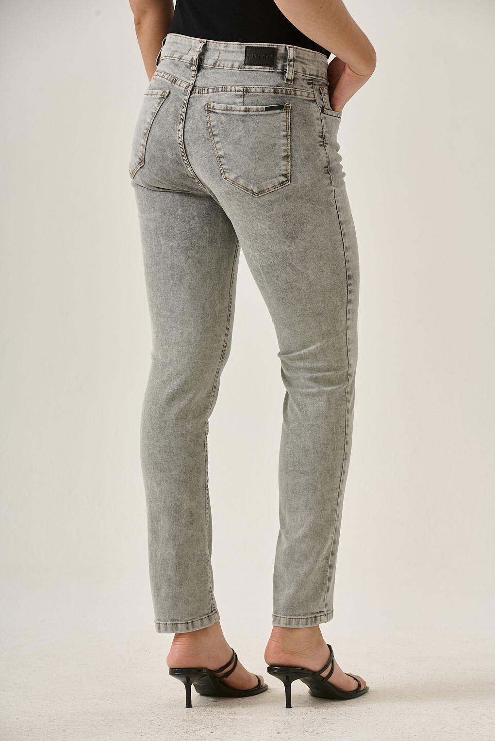 Pantalón skinny elastizado de tiro medio, color gris con efecto nevado. De ajuste cómodo y favorecedor, ideal para un look casual y moderno, fácil de combinar con diversas prendas.