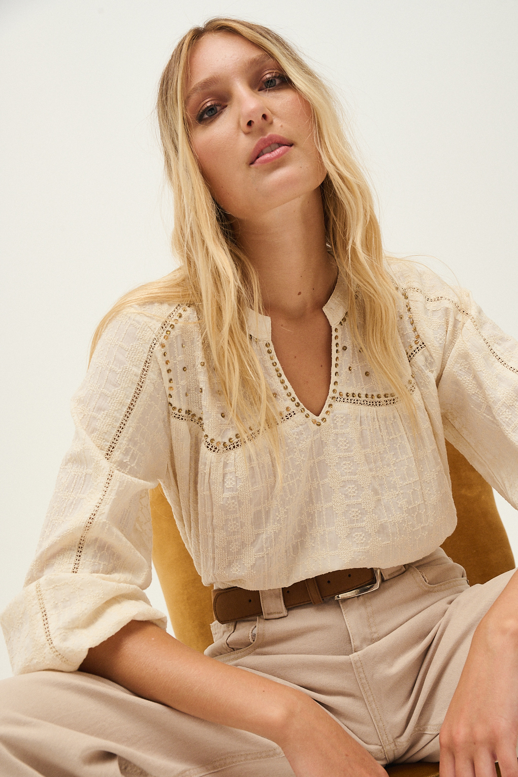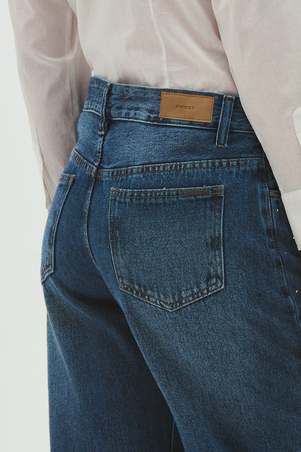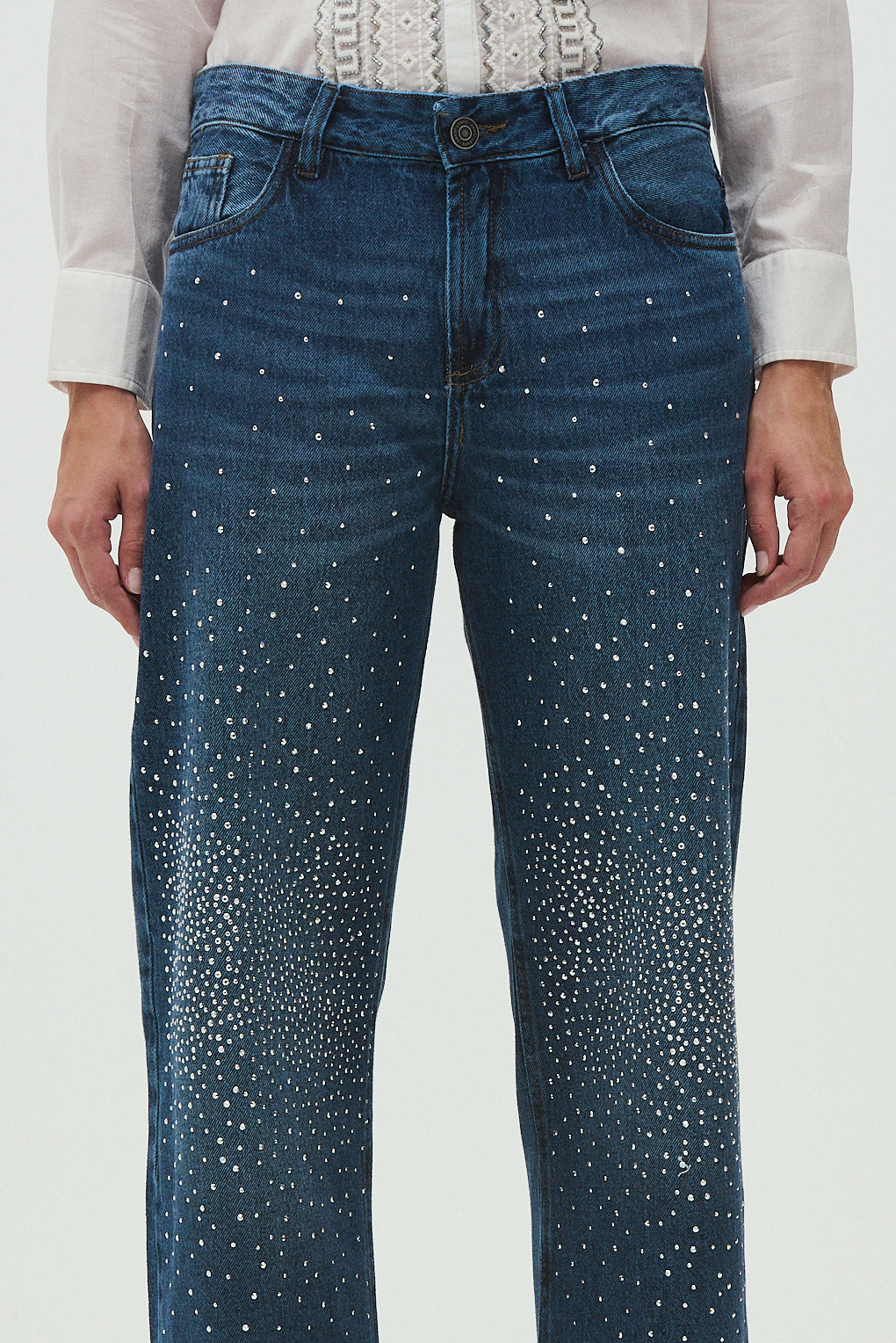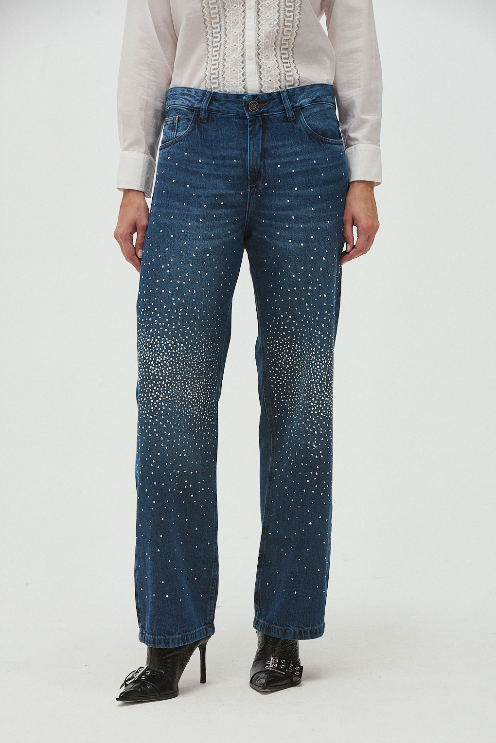 Confeccionado en denim rígido, su silueta wide leg de tiro medio garantiza comodidad y una caída espectacular. Lo más destacado: los apliques de strass en toda la parte delantera que le dan brillo y personalidad sin esfuerzo. Tiene bolsillos delanteros y traseros, pretina con pasadores y cierre con botón metálico. Una pieza statement, ideal para sumar a tu colección si amás los básicos con twist.