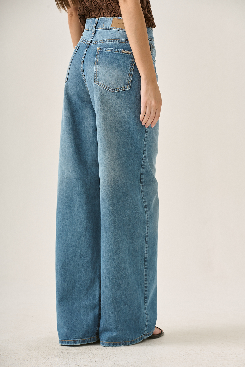 Pantalón wide leg amplio y cómodo, de tiro alto en denim rígido color azul con efecto bigote. Las costuras en hilo marrón añaden un toque de contraste, creando un look moderno y estilizado. Ideal para un estilo relajado y elegante.
