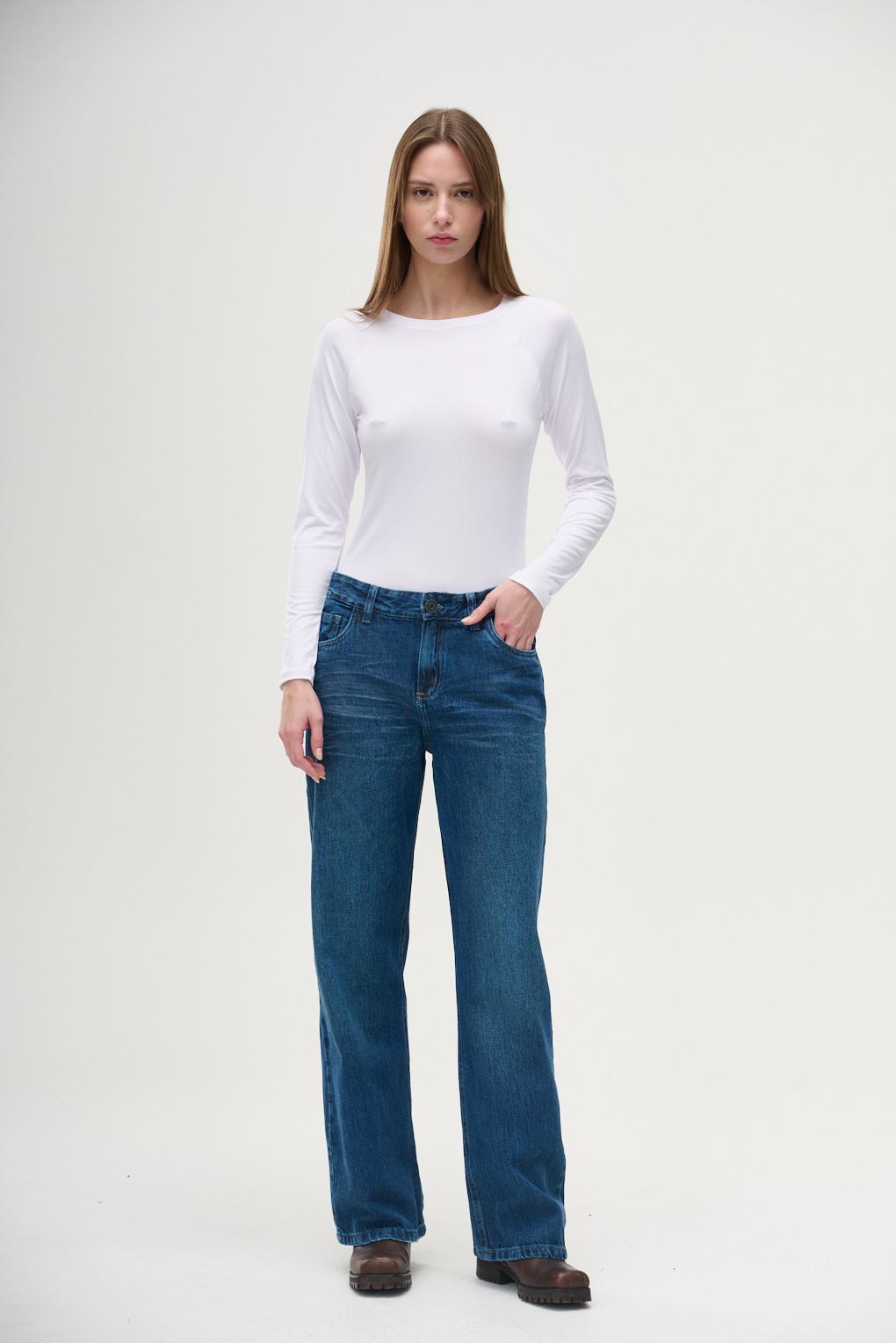 El Jean Ibo es ese denim que nunca falla. Confeccionado en denim rígido, su estructura firme mantiene la silueta y le da ese aire atemporal que combina con todo. Tiene tiro medio y un corte clásico que lo hace cómodo y versátil: va bien con zapatillas, botas o sandalias. El lavado intermedio le suma un look relajado ideal para todos los días.