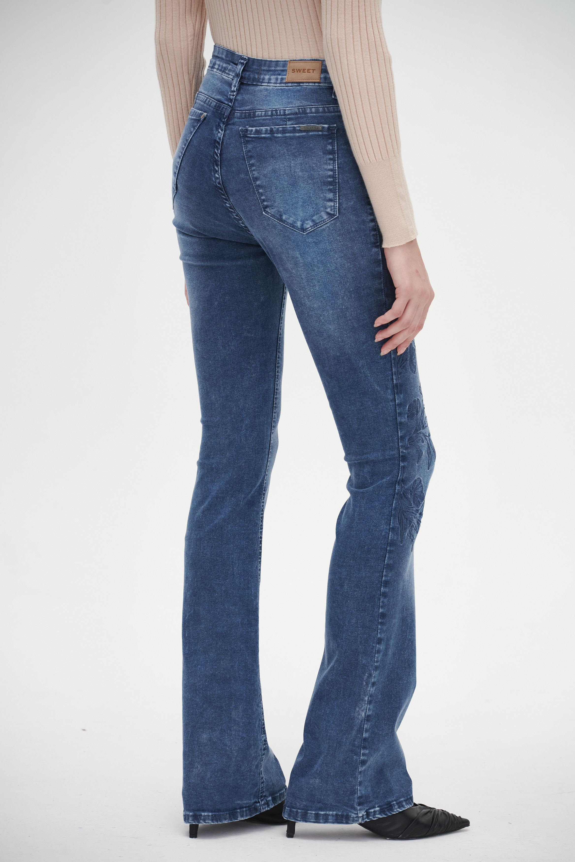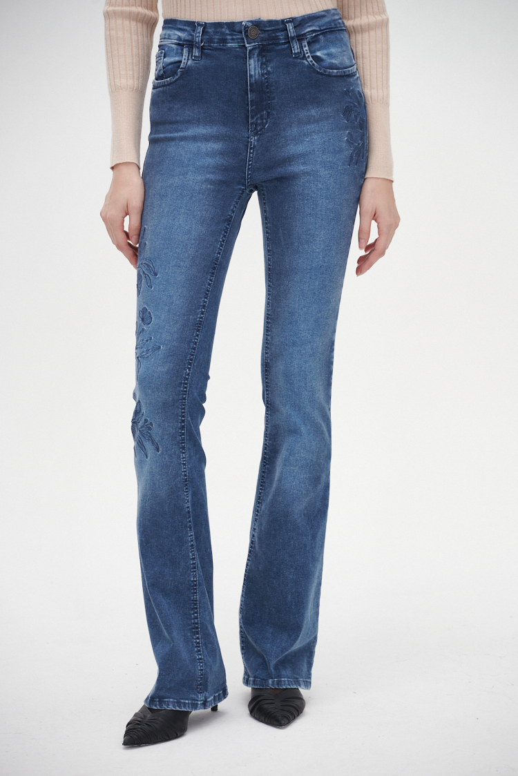 Confeccionado en denim elastizado que se adapta al cuerpo sin perder su forma, este jean de corte oxford y tiro medio estiliza la silueta con un toque retro y moderno a la vez. Se distingue por un delicado bordado floral a tono en una pierna y un detalle adicional bajo el bolsillo delantero, que aporta un aire femenino y original sin perder la sobriedad del diseño.