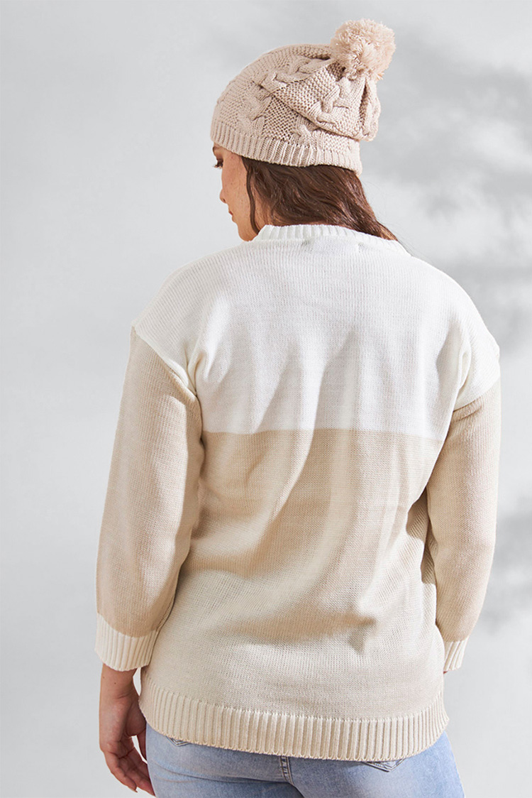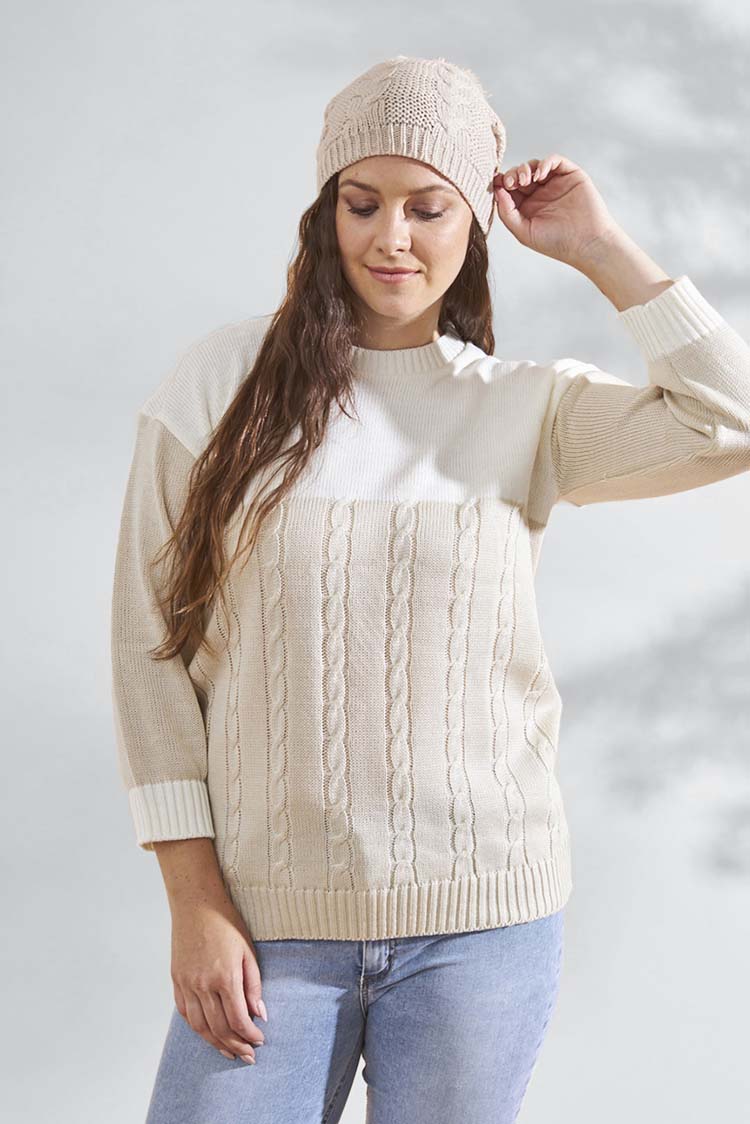 Sweater tejido combinado en dos tonos de fit recto con escote redondo y mangas largas. En la mitad del delantero, presenta un tejido en forma de ochos. Terminación de ribb. Largo modular por la cadera. Confeccionado en 100% acrílico. Un ítem ideal y original para acompañar tus conjuntos de esta temporada.