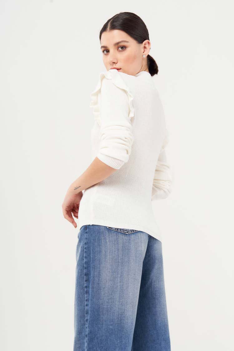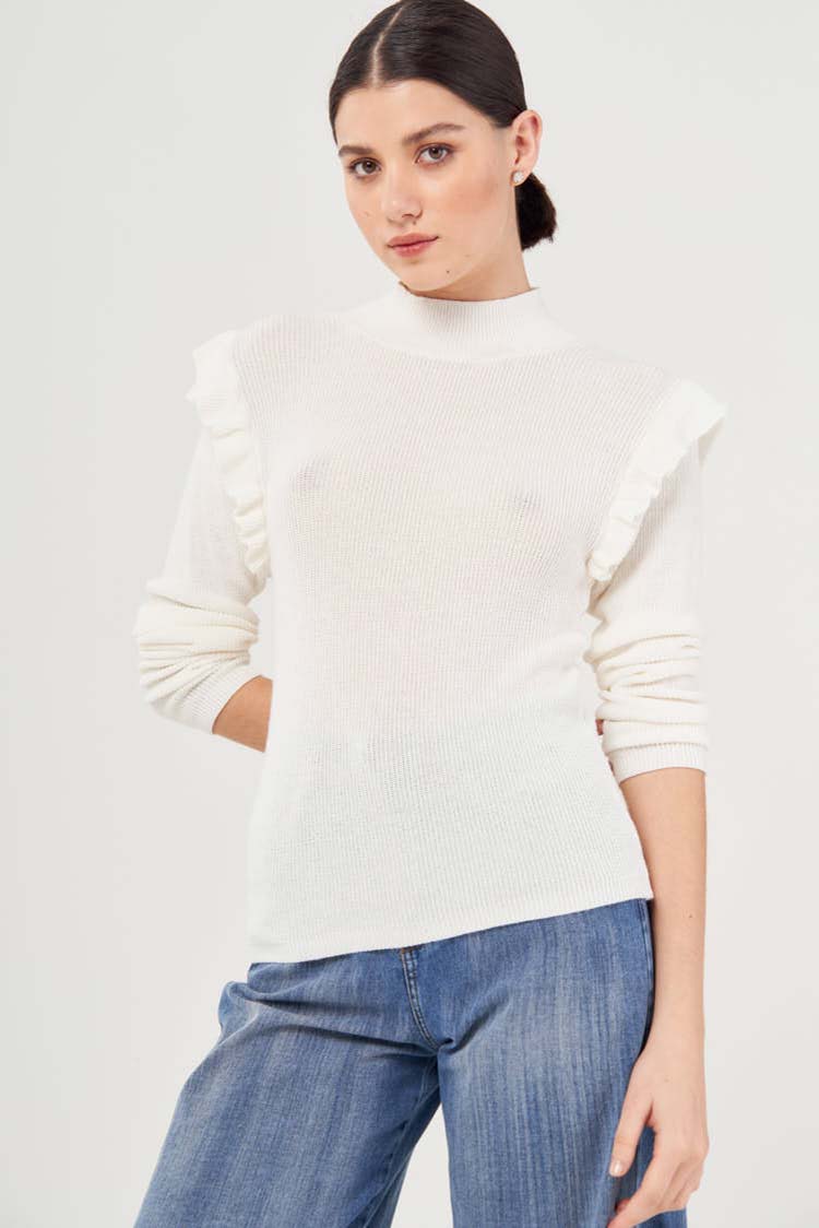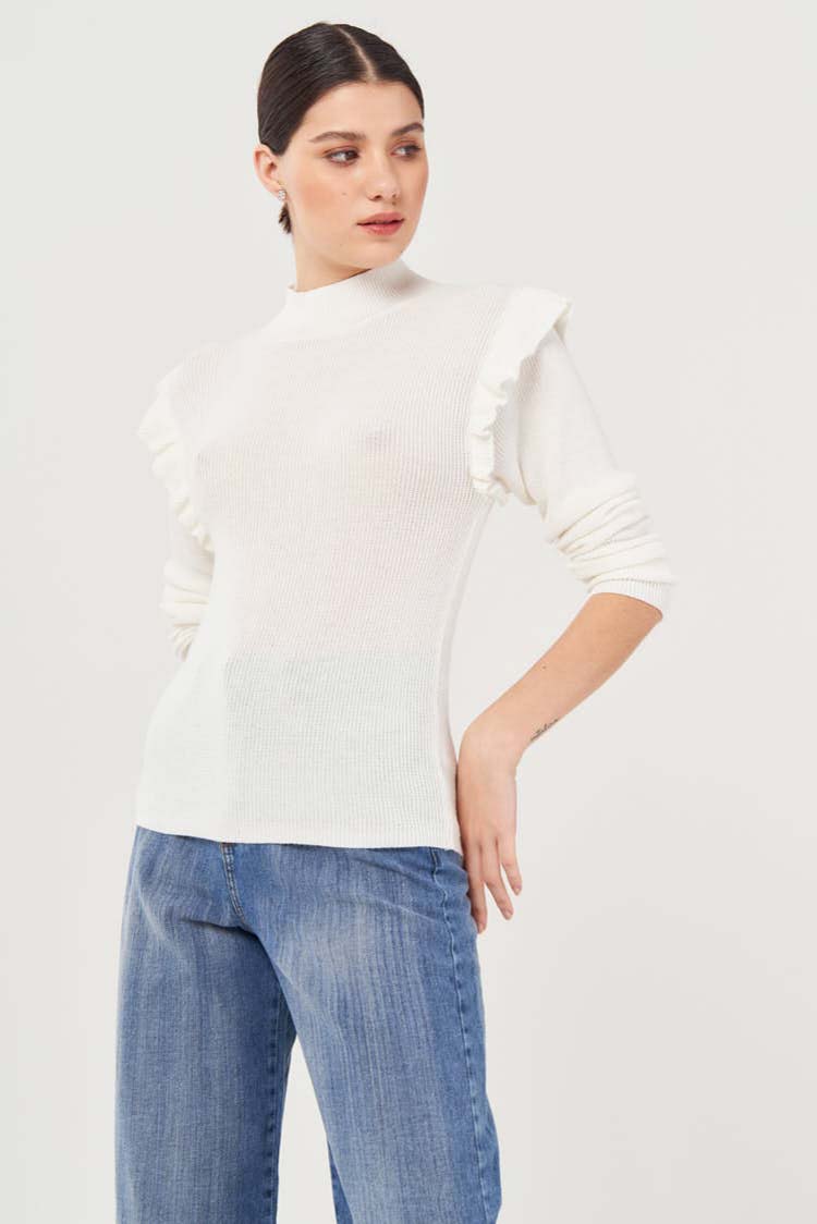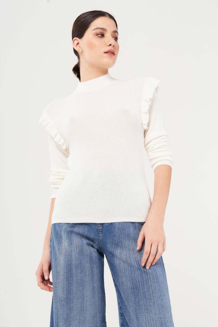 Sweater de hilo fino con cuello polera y volados recubriendo la sisa de sus mangas largas, que le agregan volumen a la misma. Tiene punto puño a crochet, fino y su largo modular es a la cadera.Un abrigo básico para acompañarte en tu día a día.