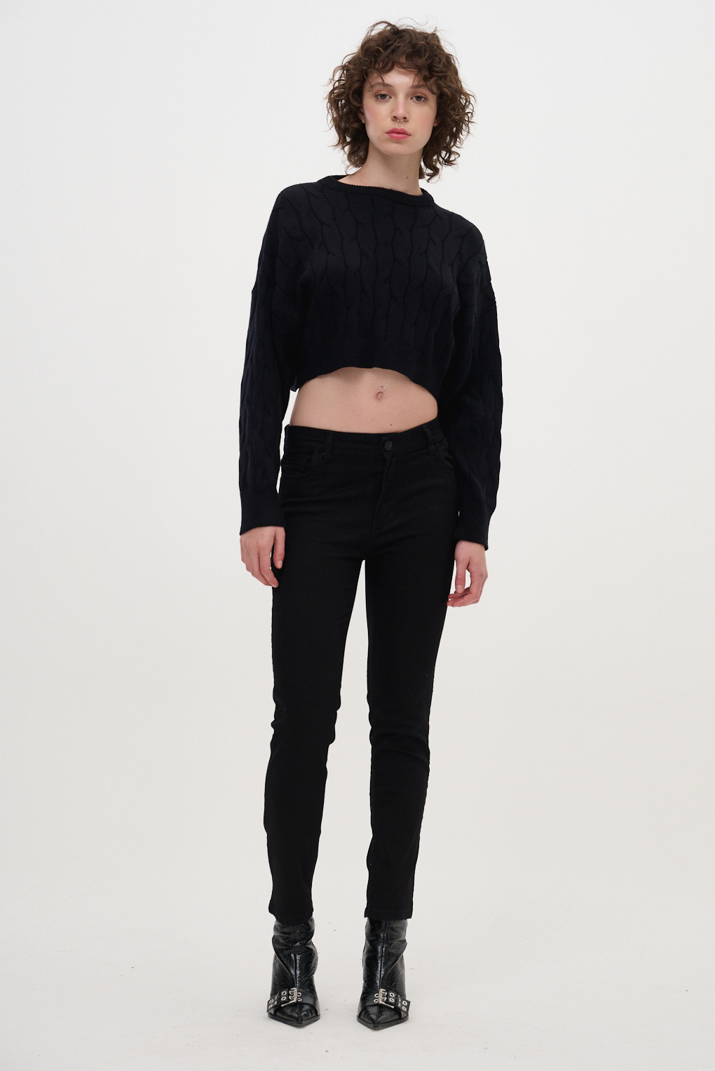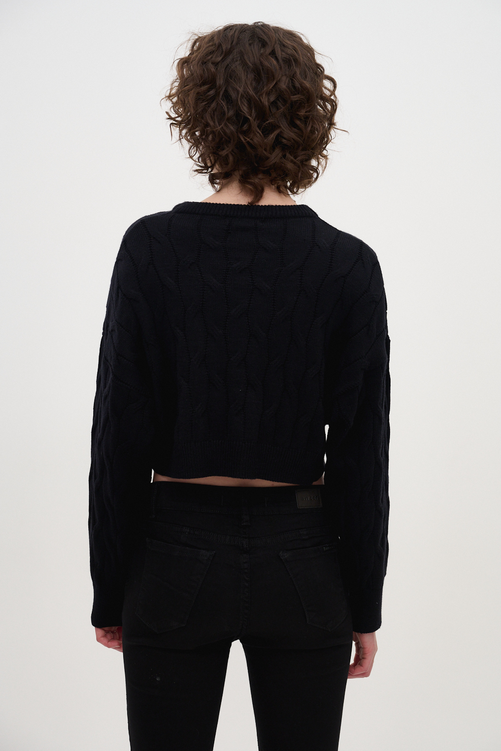 Sweater corto hasta la cintura, confeccionado en hilado Manhattan (50% viscosa - 50% poliéster). Textura trenzada, cuello redondo y calce sutilmente amplio que combina comodidad y estilo. Perfecto para completar looks casuales con un toque canchero.