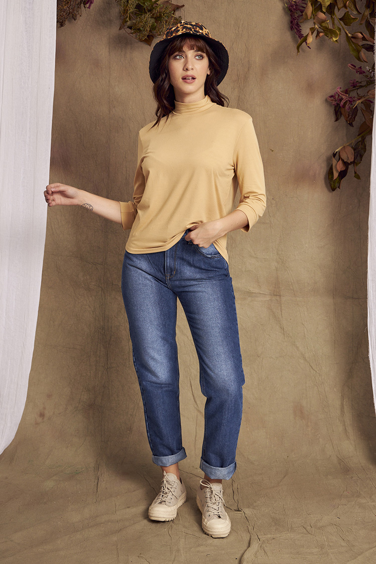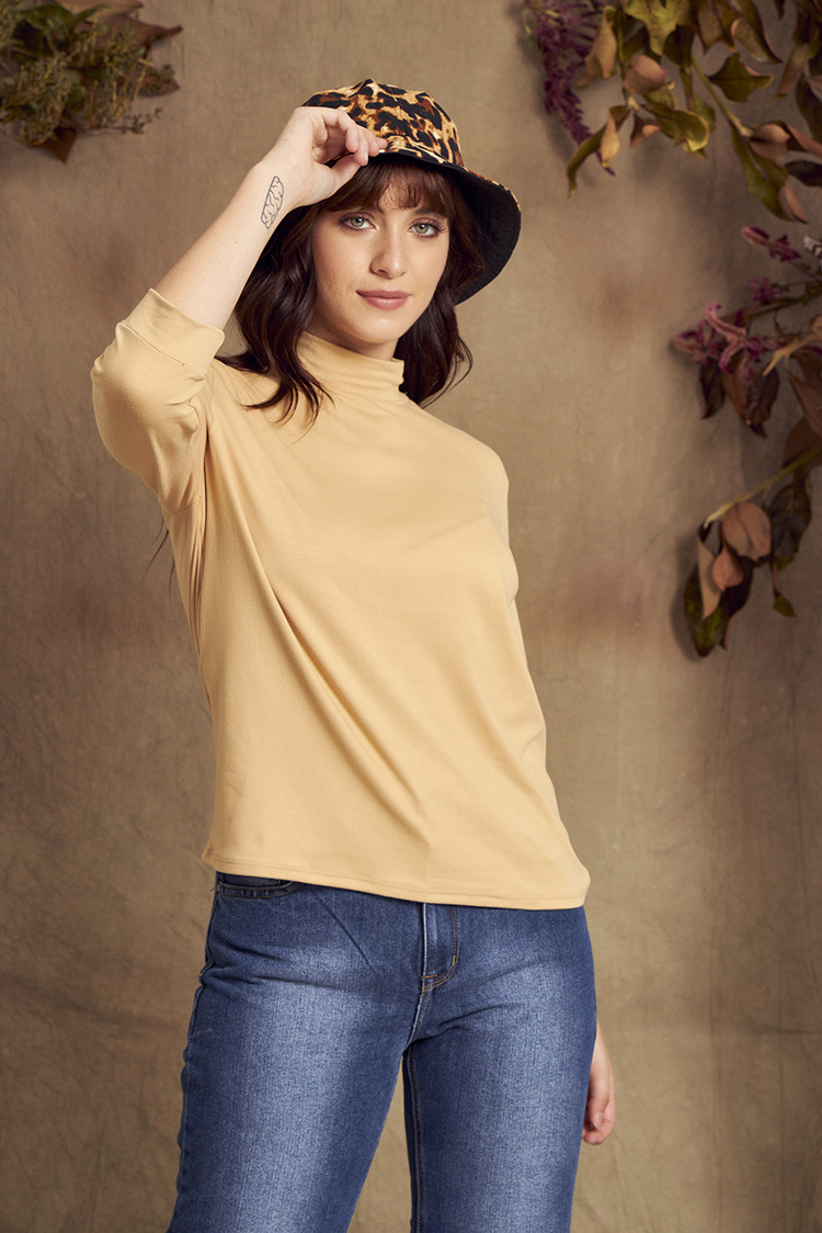 Remera lisa. Cuello media polera. Mangas 3/4 con elástico en el puño.