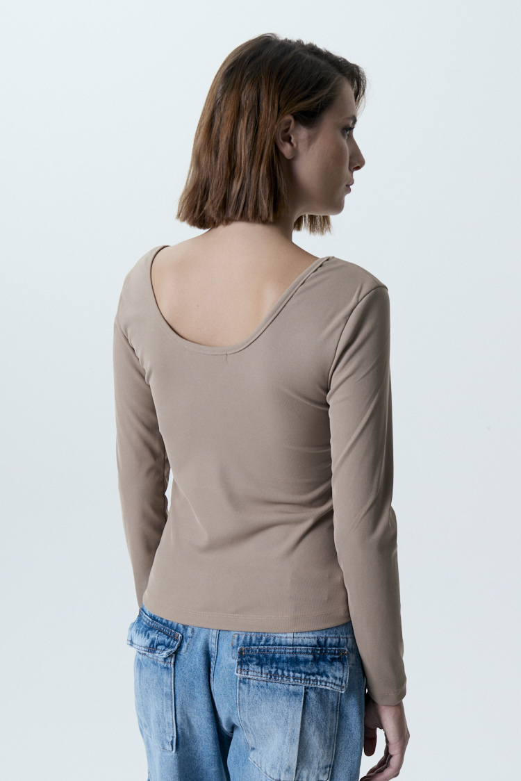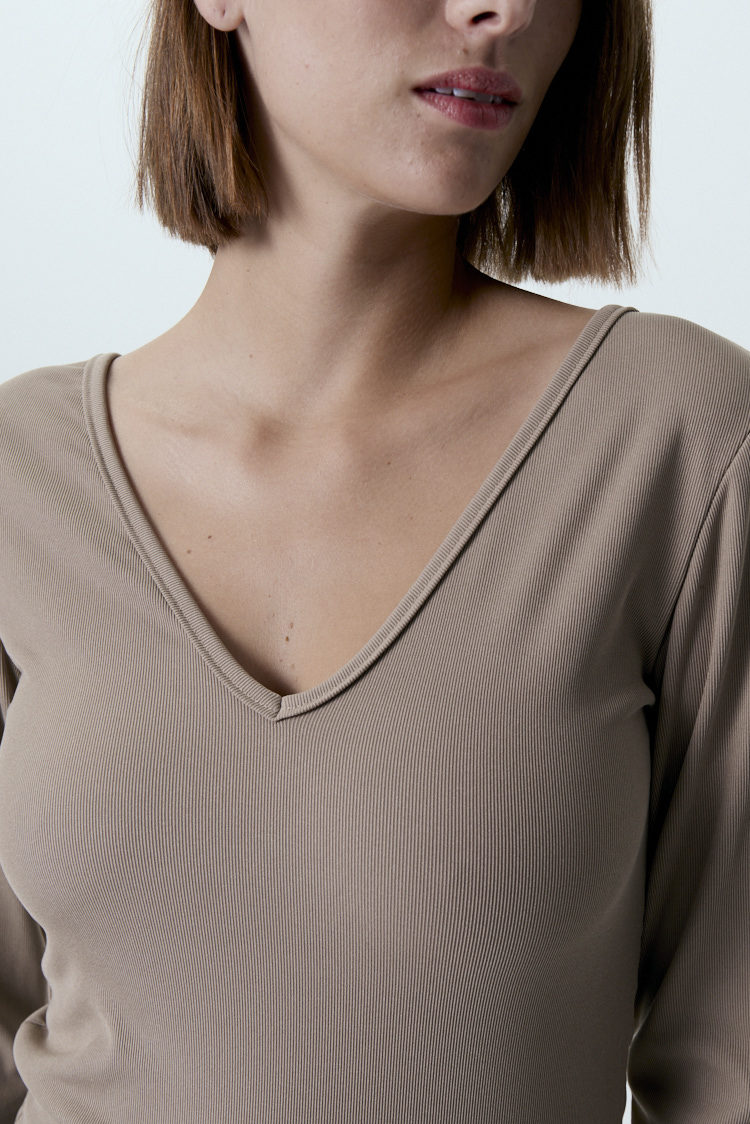La remera ML Vita de corte adherente, es una prenda básica con cuello en V y un largo hasta la cadera.