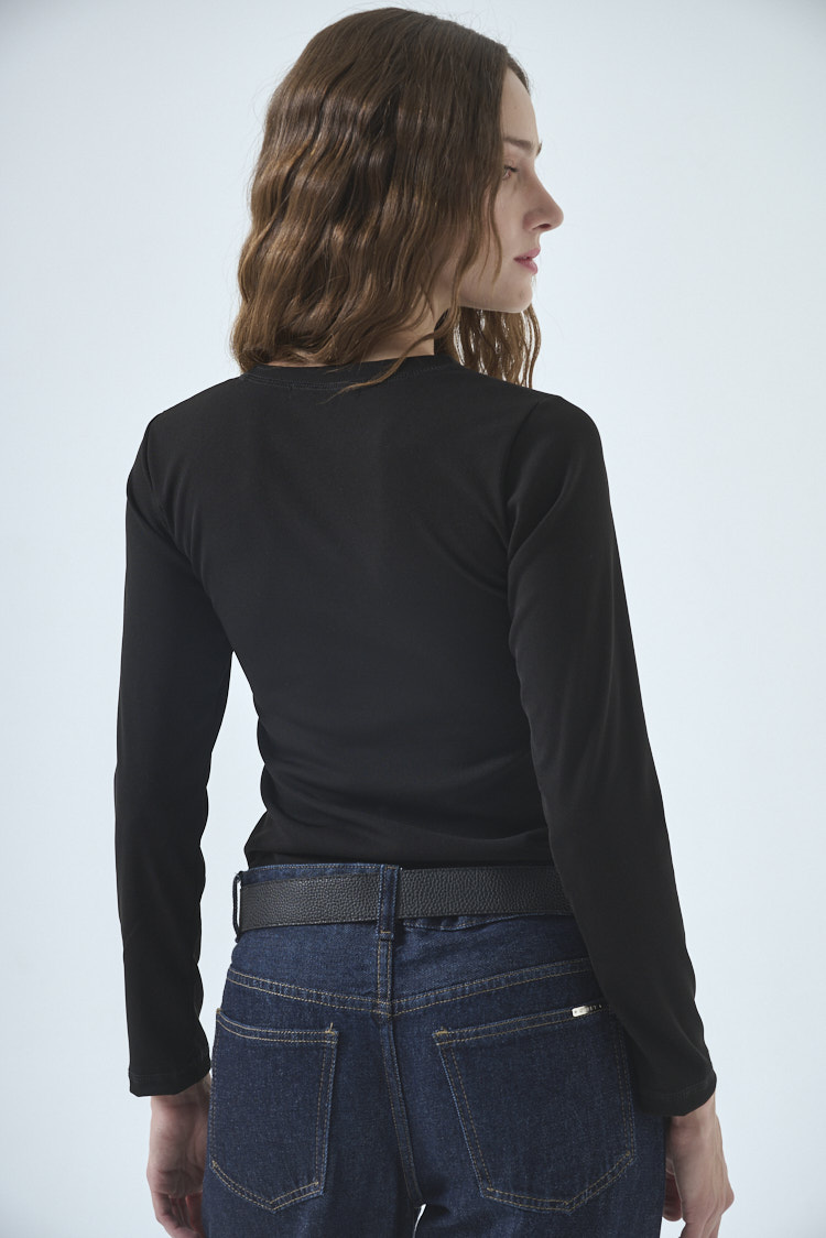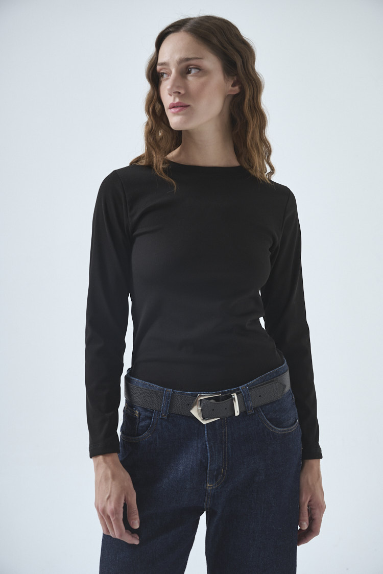 La remera ML Aiden de corte adherente, es una prenda básica con cuello redondo cerrado y largo hasta la cadera. Una prenda comodín para completar tu outfit.