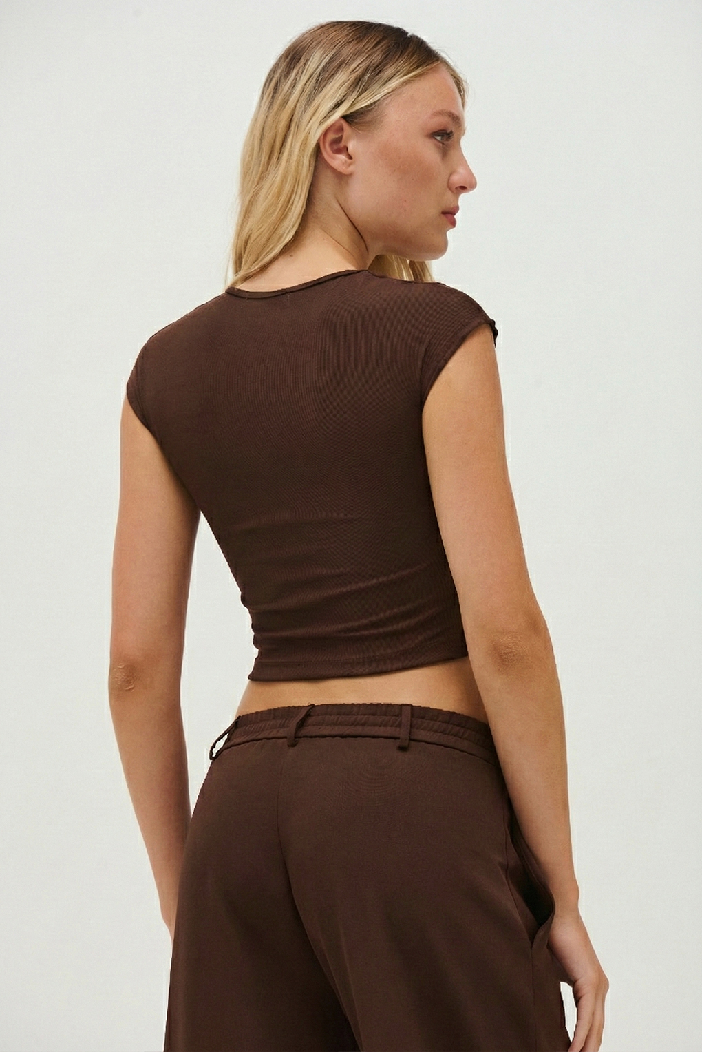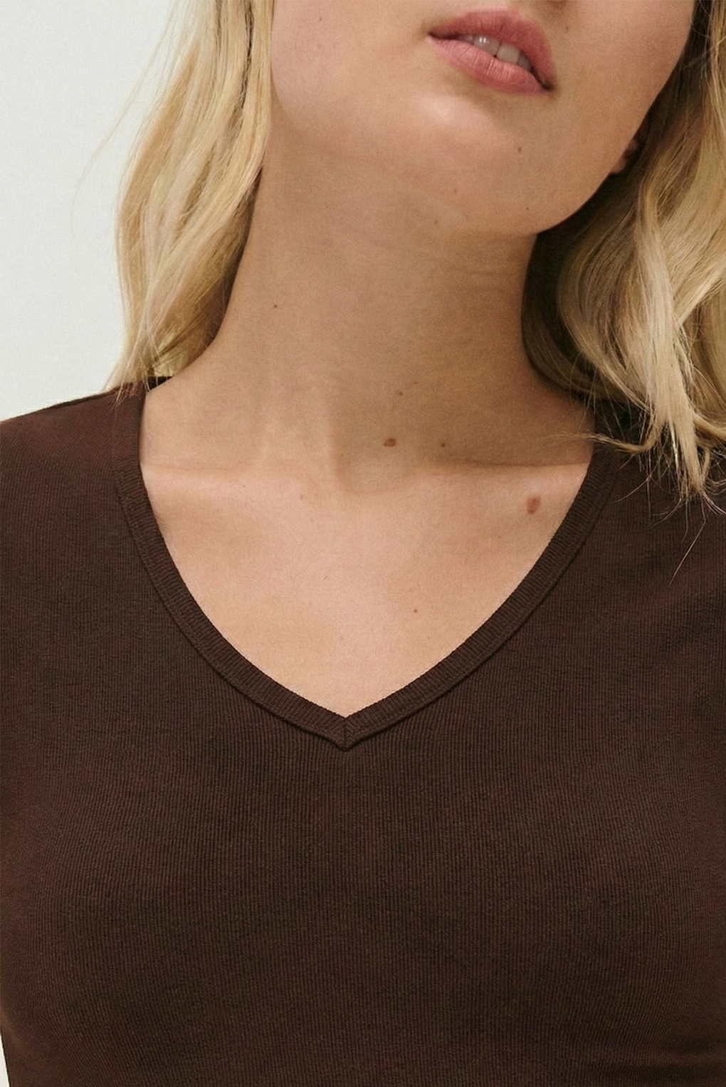 Remera básica con escote en V, confeccionada en tela ribb que se adapta al cuerpo sin perder comodidad. Su corte recto y mangas cortas la hacen ideal para el uso diario o para combinar con prendas más formales.