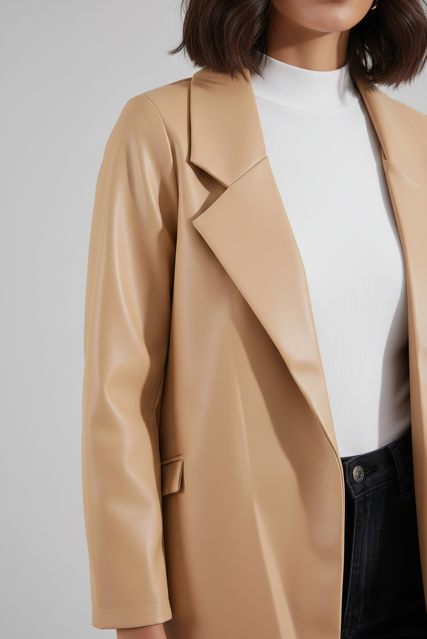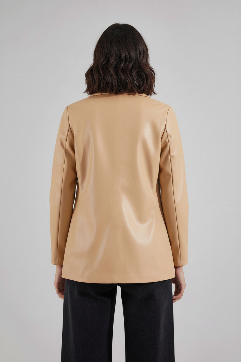 Blazer de eco cuero, estilo sastre, forrado en su interior. Con cuello extendido continuado de solapa corta. Es manga larga y su corte masculino, recto y largo modular que llega por debajo de la cadera lo hace adaptable para un outfit informal/descontracturado. Tiene bolsillo solapa y botón delantero funcional.