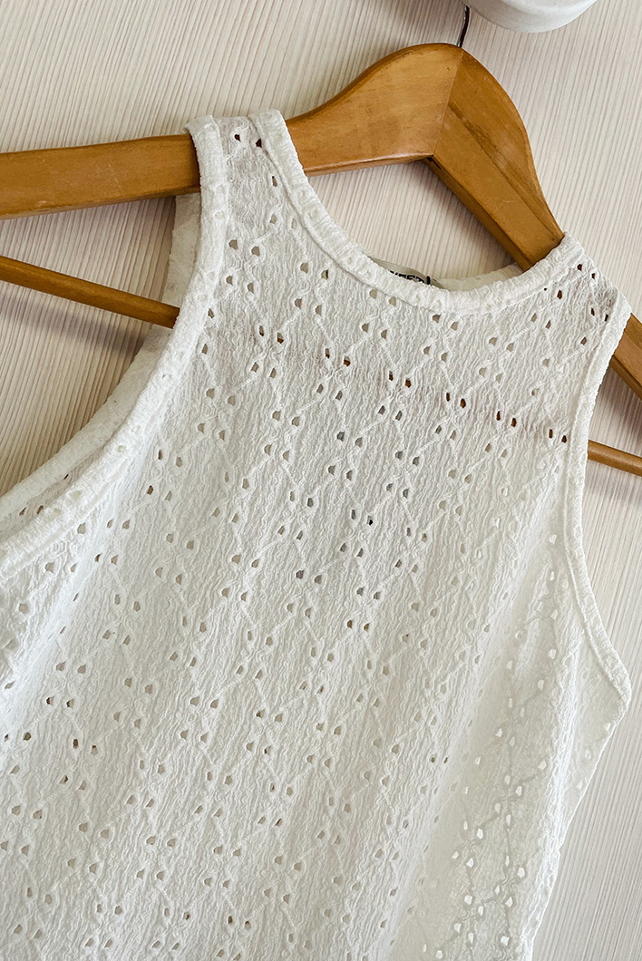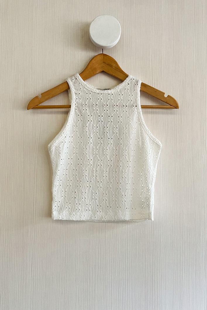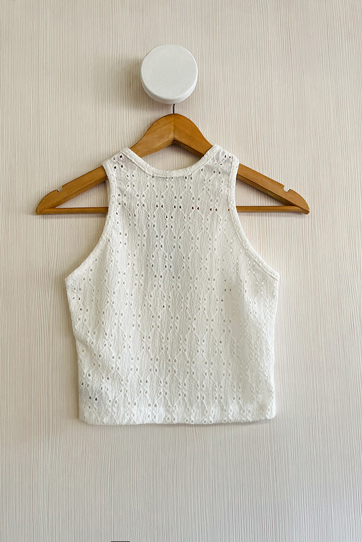 Top musculosa de encaje con cuello redondo. El calce de este top es al cuerpo y posee un largo modular por la medida de la cintura. Confeccionado en 95% viscosa y 5% elastano, un textil que se distingue por su elasticidad adaptándose al cuerpo. Es una prenda que se puede combinar tanto para día como para noche.