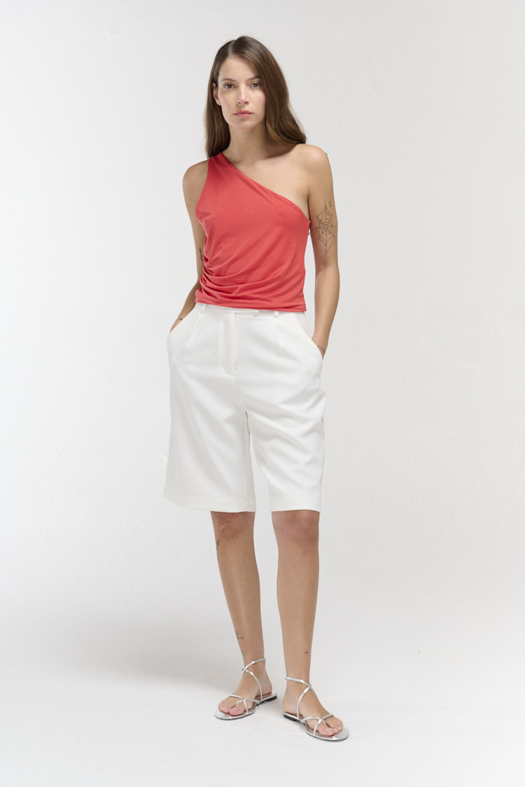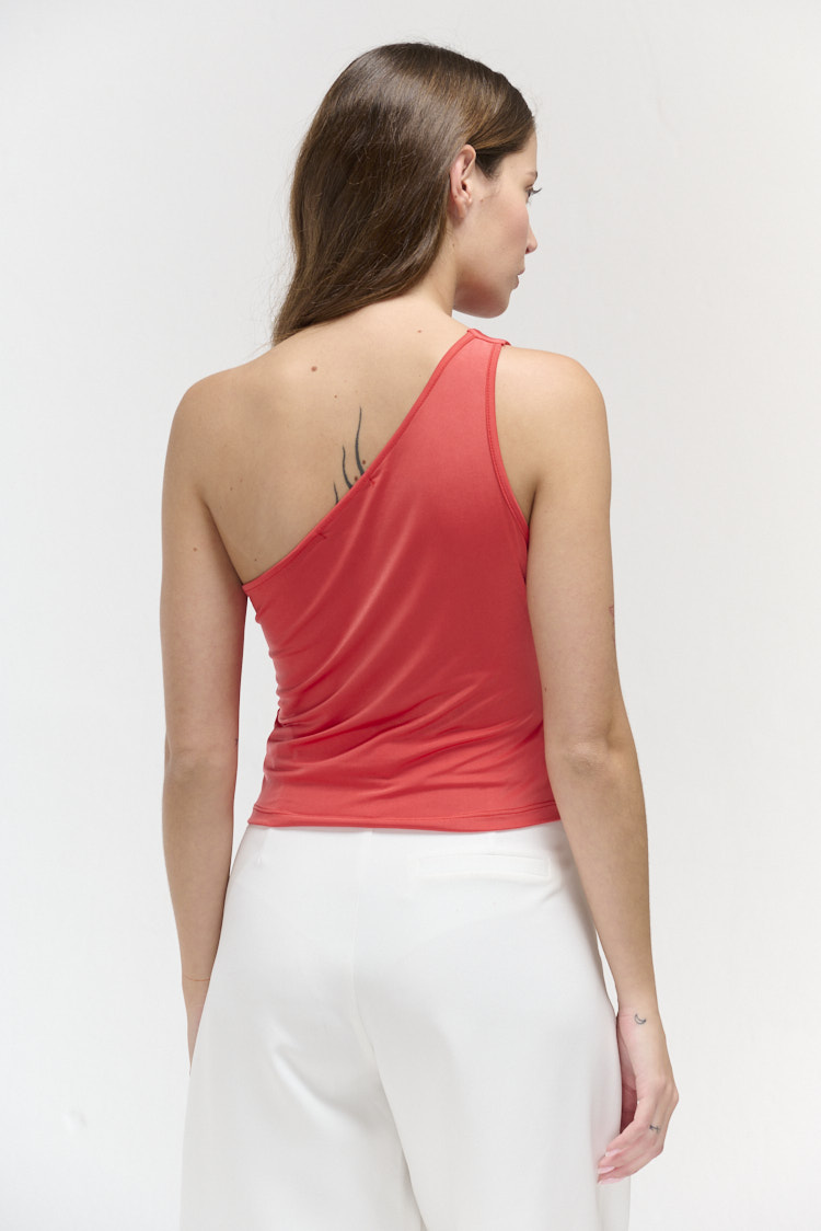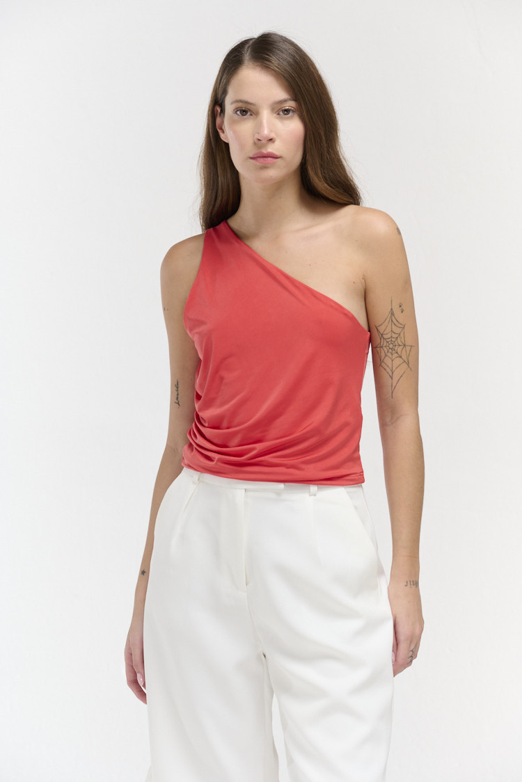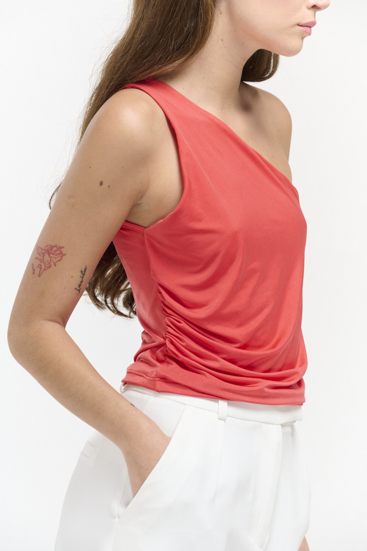 Top asimétrico confeccionado en tela de microfibra, con poliéster y elastano, ofrece una textura suave, ligera y flexible. El fruncido lateral añade un toque moderno y realza su caída natural, creando un efecto visual favorecedor.