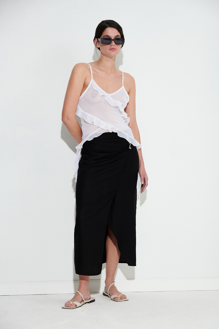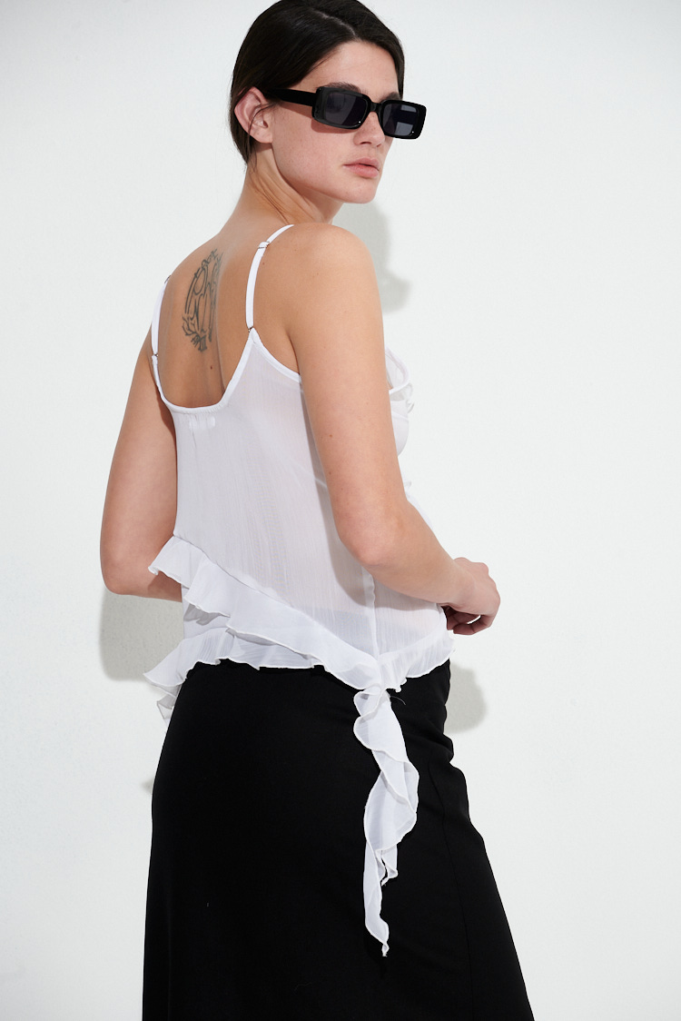 El Top Gipso esta confeccionado en tela de gasa, su diseño liviano y fluido resalta la feminidad, mientras que los volados cruzados en el frente aportan dinamismo y un aire sofisticado. Ideal para combinar con jeans, faldas o pantalones de vestir, esta prenda es perfecta para ocasiones especiales o para elevar cualquier look diario. Su caída suave y su textura etérea la convierten en un básico infaltable en tu guardarropa.