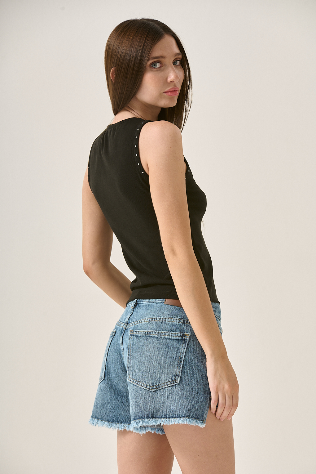 La Musculosa Dakota está confeccionada en tela morley, un tejido con elasticidad y textura acanalada que se adapta al cuerpo con suavidad. Su diseño sin mangas y escote cerrado se realza con apliques de tachas metálicas en hombros y sisas, aportando un toque moderno y urbano. Perfecta para combinar con jeans, minis o pantalones sastreros, es una prenda versátil que eleva cualquier look con un detalle sutil pero distintivo. Ideal para el verano o para usar en capas durante el entretiempo.