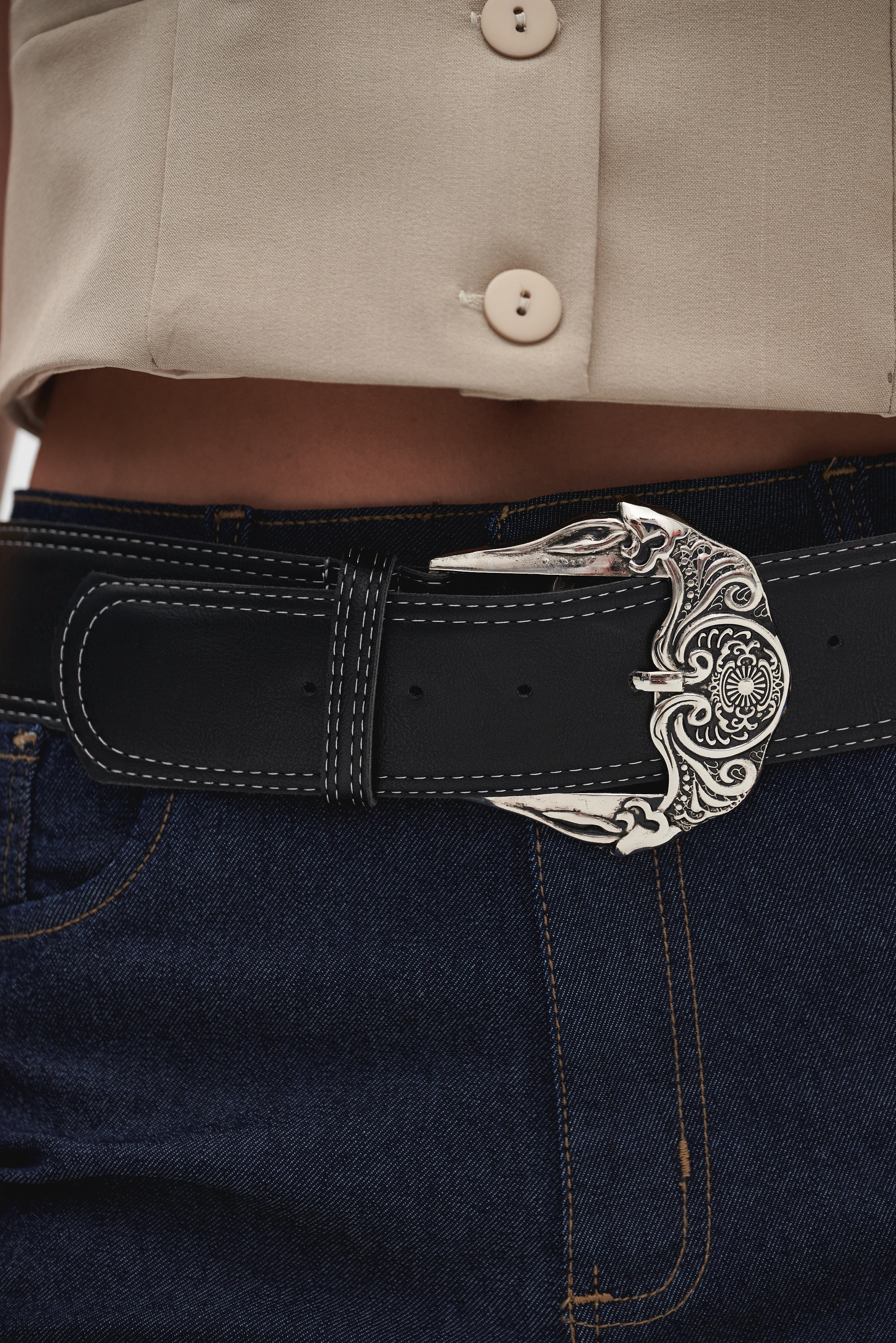 Su protagonista es una hebilla estilo western, con relieves y formas ornamentales. Ideal para quienes quieren sumar carácter y personalidad a su outfit sin perder elegancia.