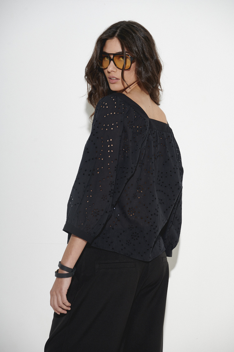 Blusa lisa con broderié cut-out, de corte recto y calce holgado. Está confeccionada en hilo de algodón y fibras sintéticas. Posee escote y espalda cuadrada, mangas 3/4 y botones frontales a tono. Su largo es regular a la cadera.