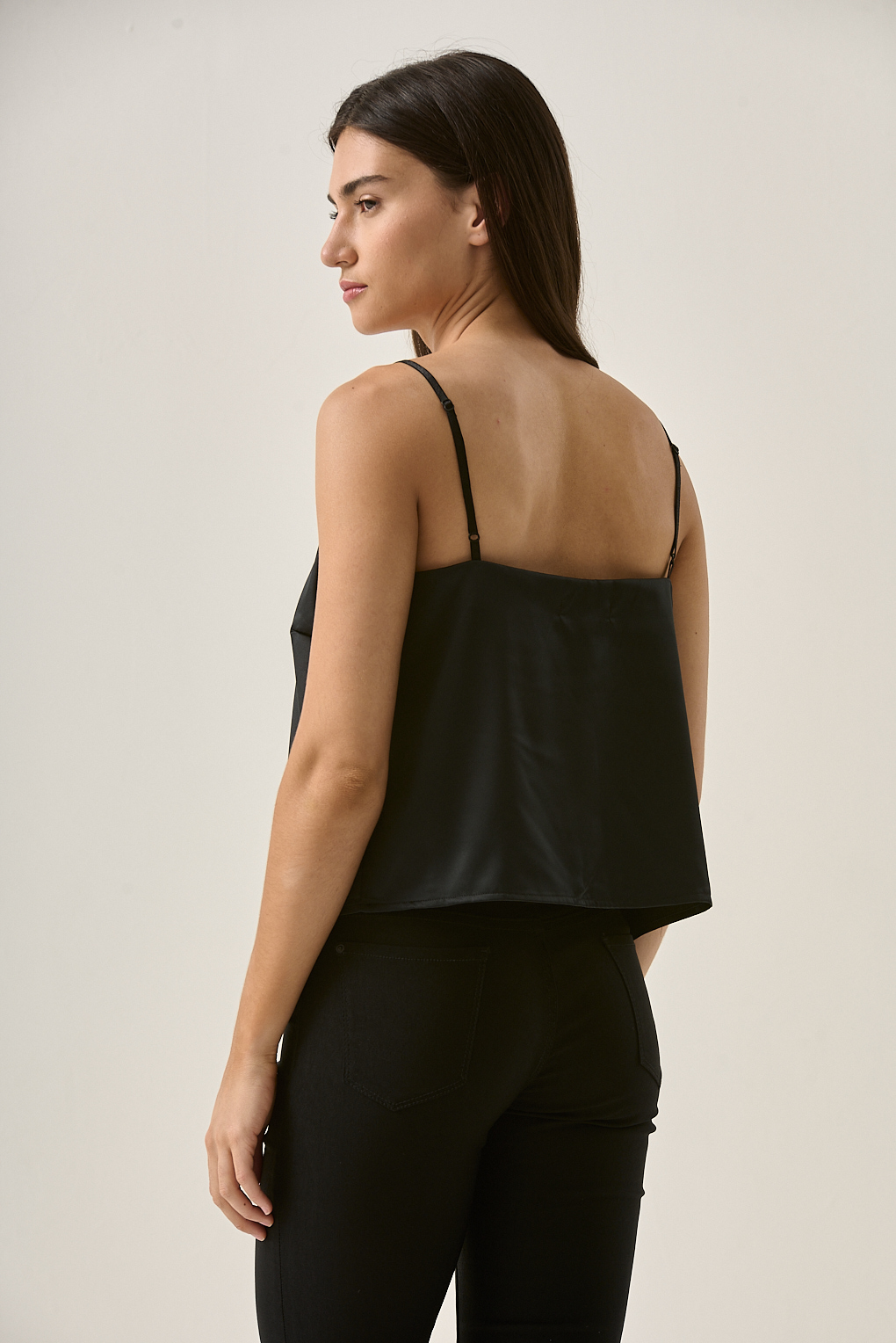 La blusa Candela está confeccionada en satén liviano, con caída suave y brillo sutil. Presenta breteles finos y un delicado detalle de puntilla en el escote, aportando un toque femenino y elegante. Ideal para combinar con jeans, pantalones sastreros o faldas para looks tanto de día como de noche.
