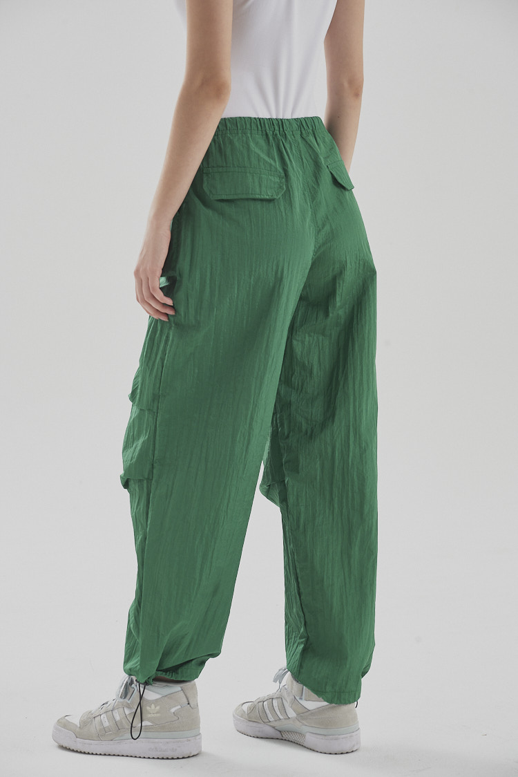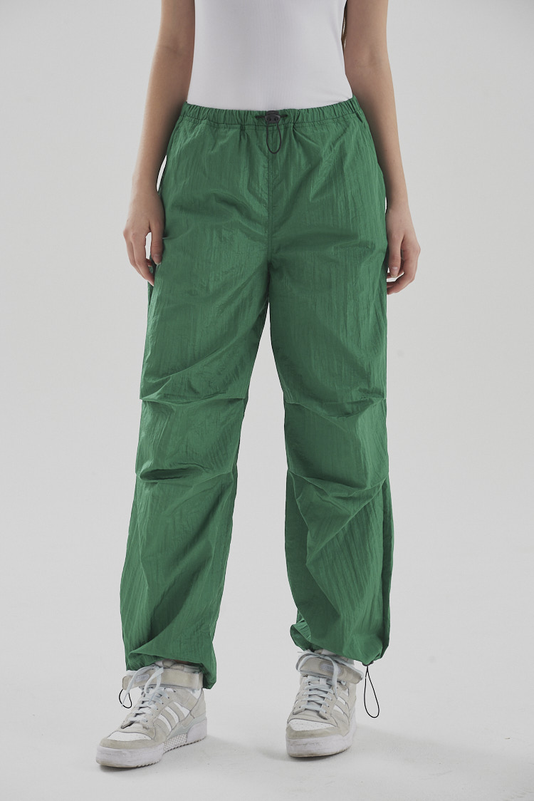 ¡Los Parachutes Pants son la tendencia! Es un corte de pantalón fluido y cómodo. No los vas a querer dejar de usar. De tiro alto. Tiene cintura con elástico ajustable al igual que en su terminación ajustando en los tobillos. Presenta pinzas horizontales a la altura de las rodillas dando efecto capas y arrugado. Modelo de cómoda movilidad.