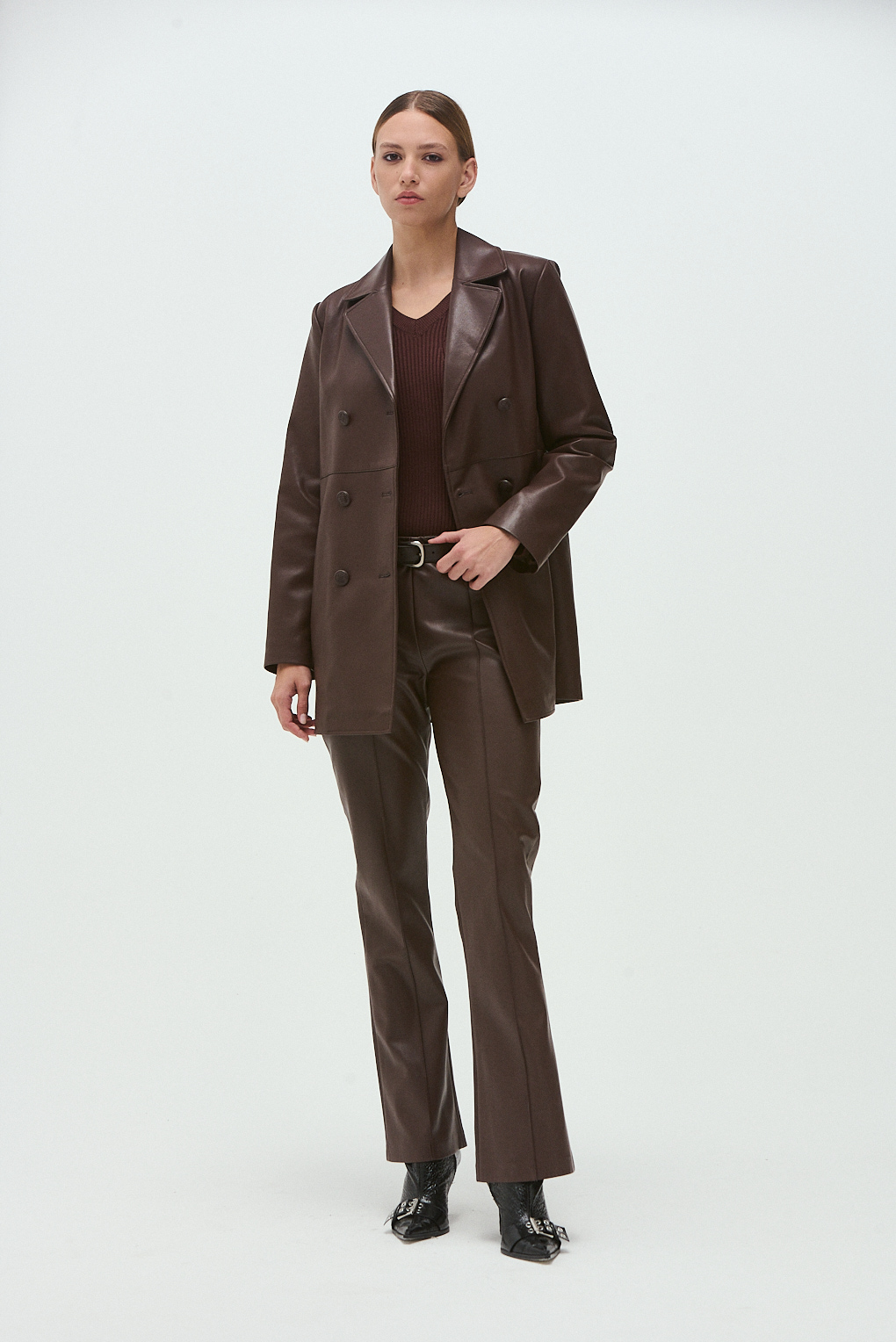 El Blazer Carrie es una prenda protagonista que eleva cualquier look. Confeccionado en eco cuero, presenta un diseño sastrero con doble botonadura que aporta estructura y carácter. Está completamente forrado por dentro, lo que suma confort y mejor calce. Ideal para usar tanto en looks urbanos como en combinaciones más nocturnas, con jeans, pantalones sastreros o vestidos.