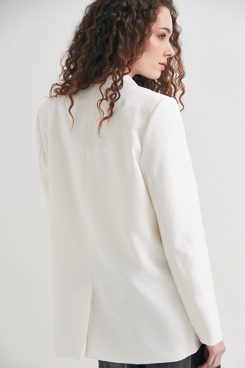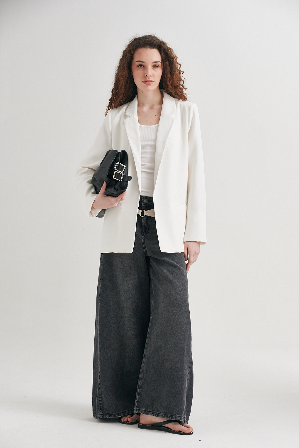 El blazer Nix es una prenda versátil y elegante, confeccionada en tela sastrera que aporta estructura y caída impecable. Su diseño de corte recto y largo le otorga un aire moderno, mientras que las solapas clásicas y los bolsillos ojal al frente mantienen la estética atemporal. Es perfecto para elevar un look casual o complementar un conjunto de oficina, adaptándose a distintas ocasiones con facilidad.