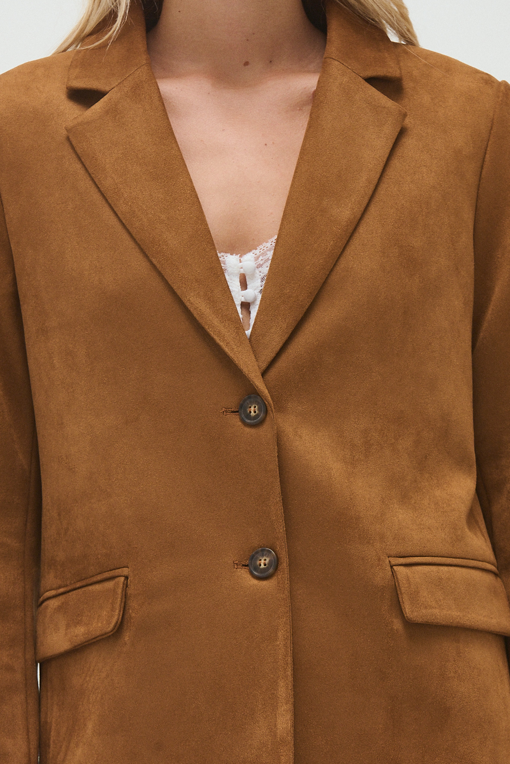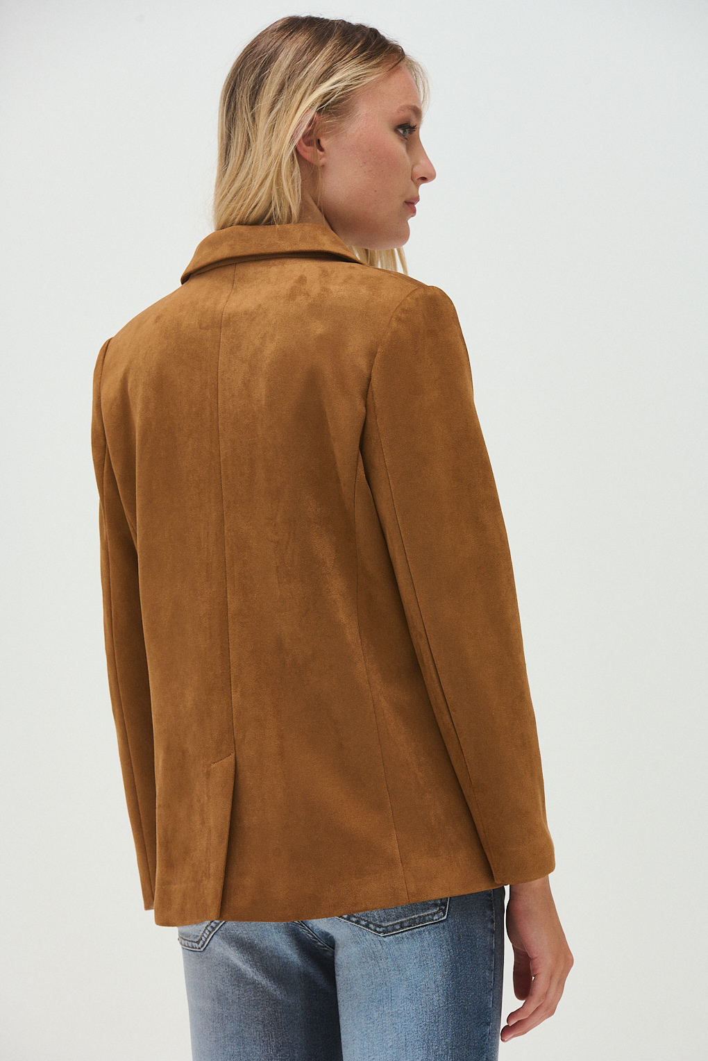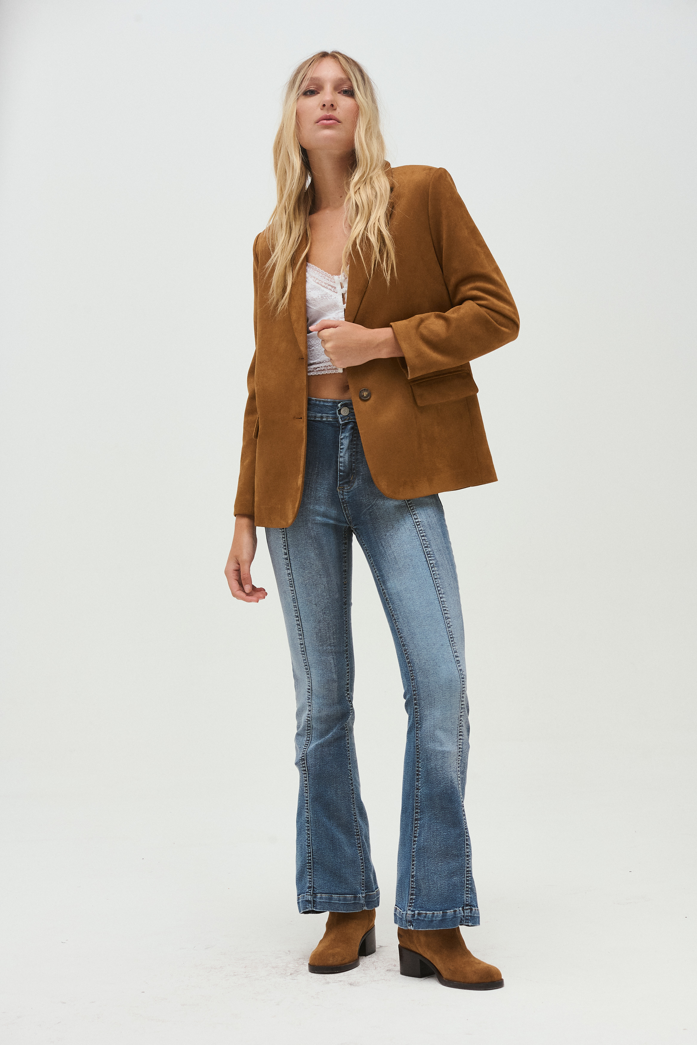 El Blazer Sally está confeccionado en gamuza suave, con un diseño atemporal que eleva cualquier outfit. Presenta solapas clásicas, cierre frontal con botón y bolsillos con tapa, que aportan un aire sastrero prolijo pero relajado. Su estructura acompaña el cuerpo sin sentirse rígida, logrando un equilibrio ideal entre elegancia y comodidad. Es una prenda clave para looks de invierno: funciona perfecto con jeans, pantalones sastreros o incluso sobre vestidos para sumar abrigo y estilo.