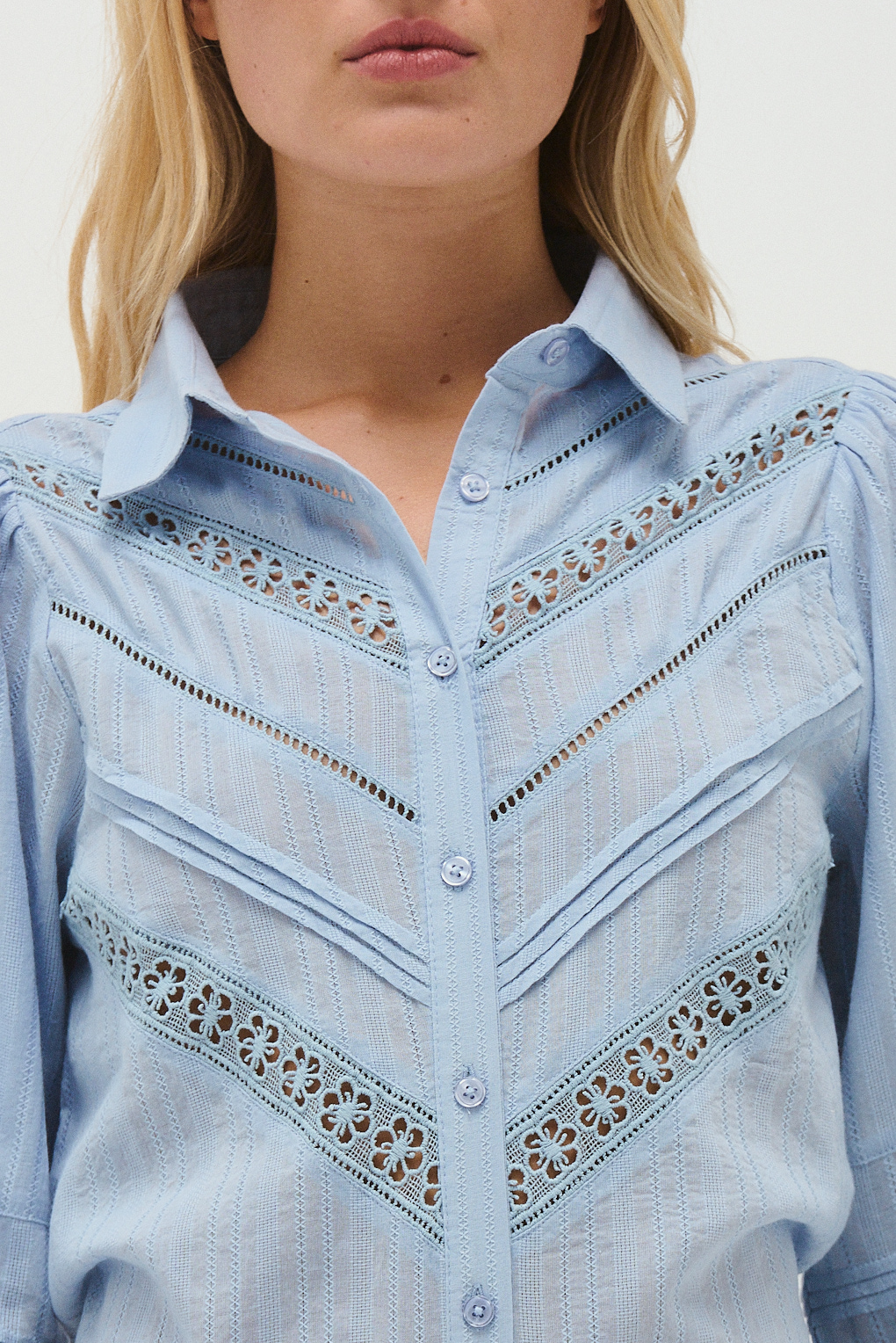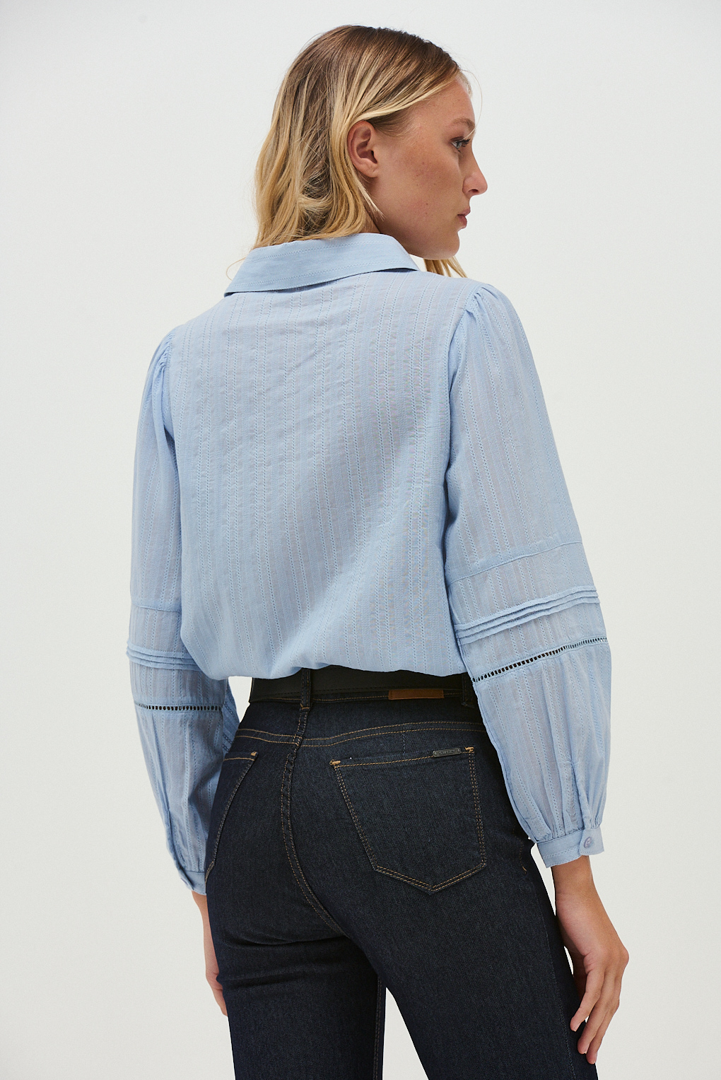 La Blusa Arianne combina un diseño delicado con detalles que aportan textura y sofisticación. Presenta cuello camisero y cartera frontal con botones, acompañados por recortes con calados y pespuntes que generan un efecto visual elegante. Sus mangas largas con puño aportan estructura y equilibrio a la silueta. Ideal para combinar con jeans o pantalones sastreros, es una prenda versátil que suma un toque romántico y moderno al look.