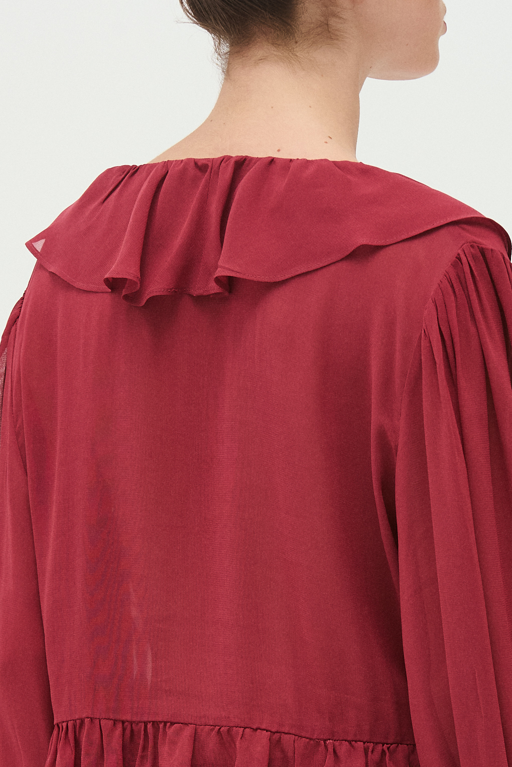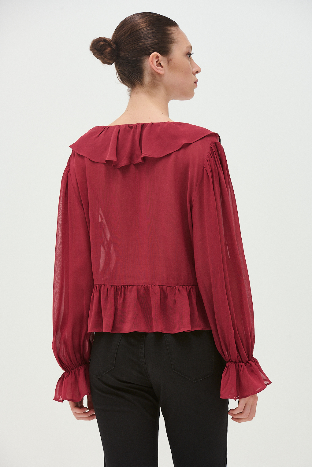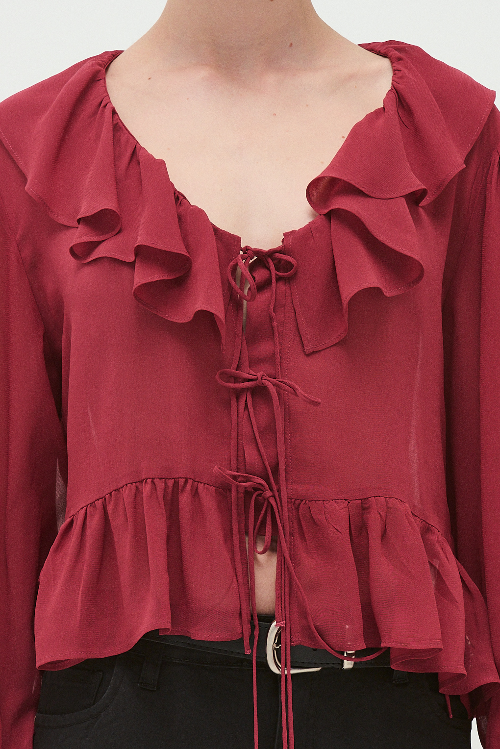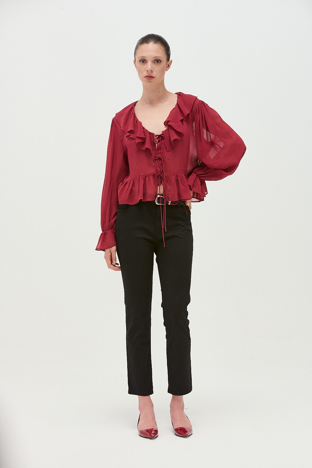 La Blusa Azucena está confeccionada en gasa, una tela liviana y fluida que aporta movimiento y un look delicado. Su diseño se destaca por el escote en V con volados y tiras para anudar, que realzan el frente de la prenda. Las mangas largas cuentan con puños fruncidos que suman un detalle femenino y equilibran la silueta. Es ideal para looks románticos o para elevar outfits diarios, combinándola con jeans, pantalones sastreros o faldas.