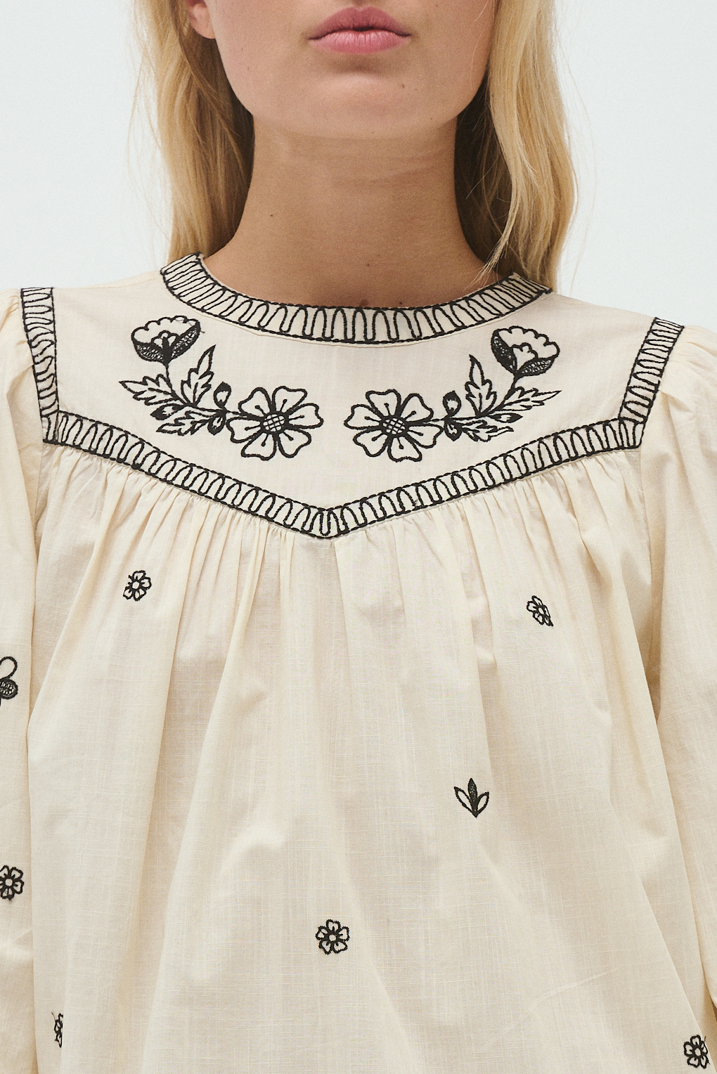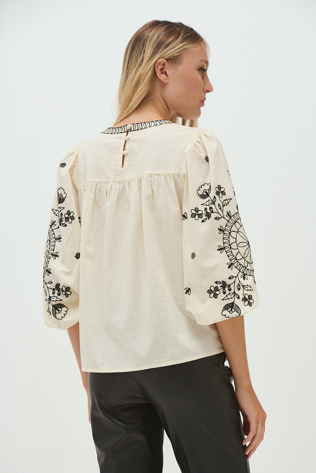 La blusa Izel está confeccionada en algodón, lo que la hace liviana y cómoda para el uso diario. Su diseño se destaca por el bordado floral en contraste, presente en el frente y las mangas, que le aporta un aire delicado y artesanal.