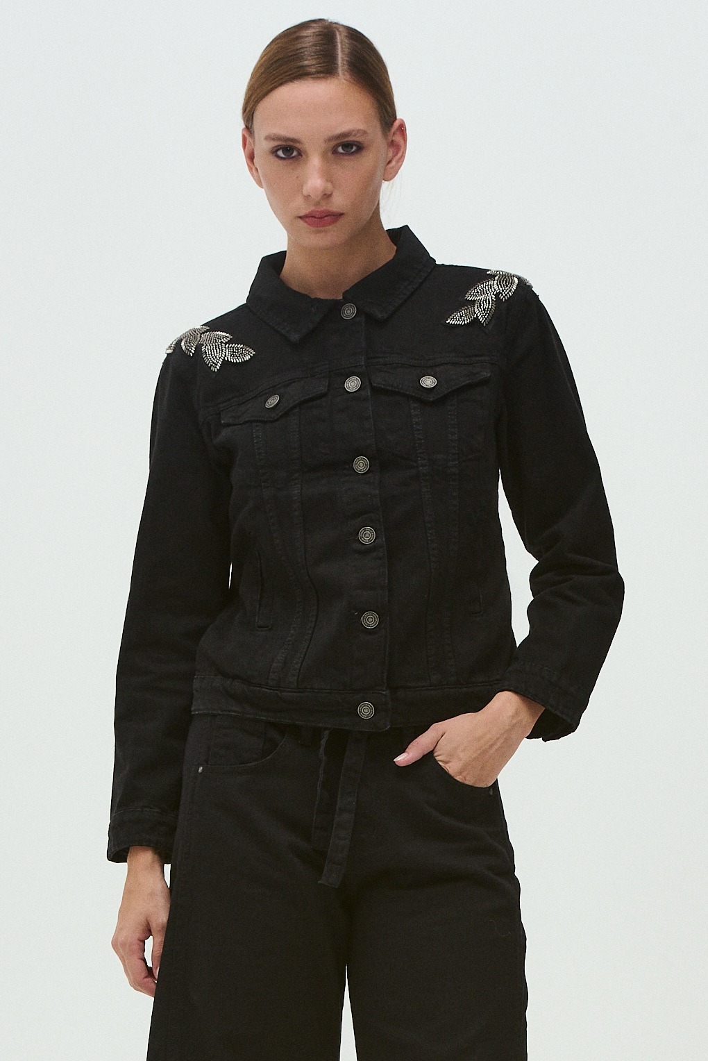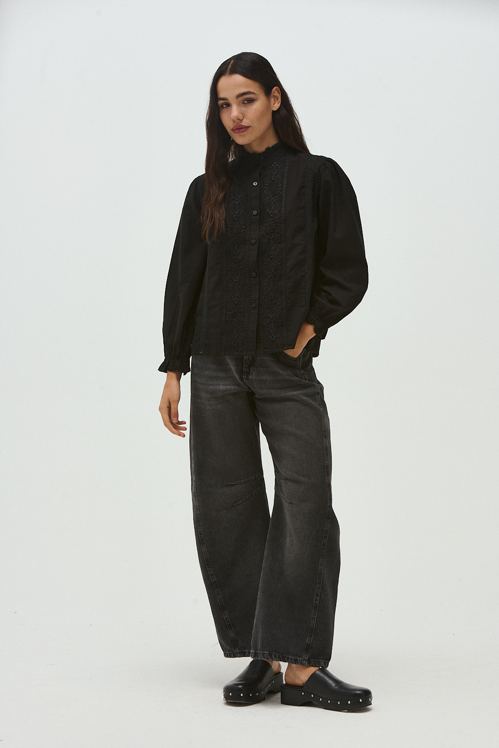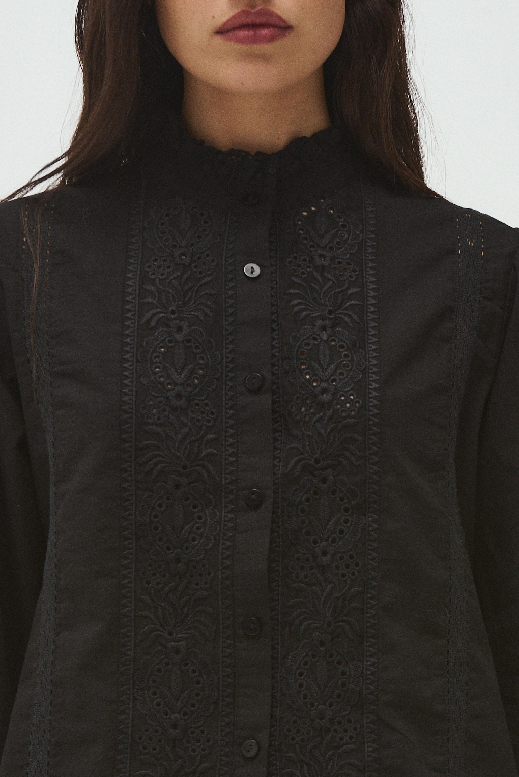 La Camisa Isabel está confeccionada en 100% algodón, aportando frescura y comodidad. Su diseño destaca por el bordado de broderie en la parte delantera, que le da un aire delicado y romántico. Cuenta con mangas largas con puños elastizados, abotonadura al frente y un cuello con volado fruncido, que suma un toque sofisticado.