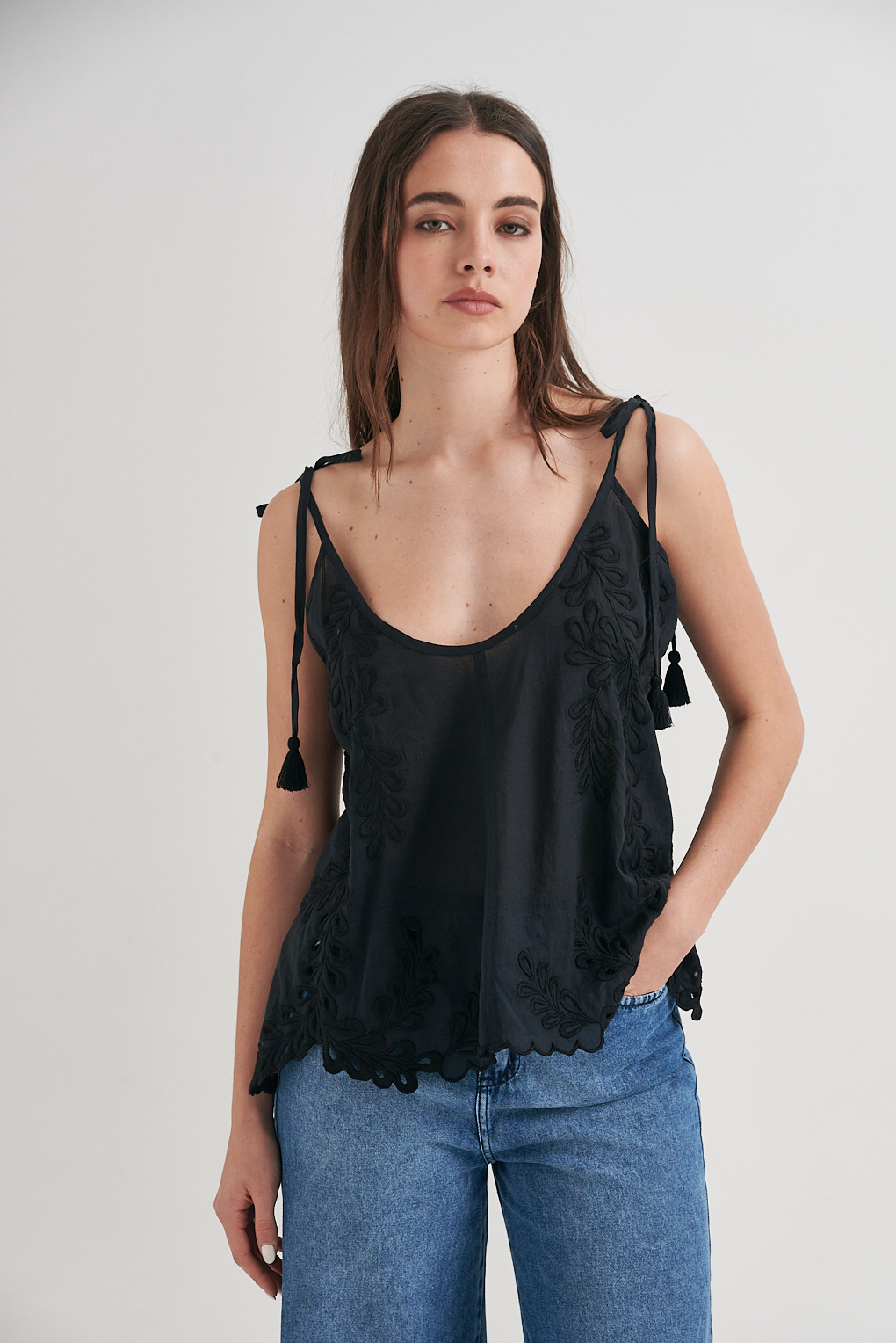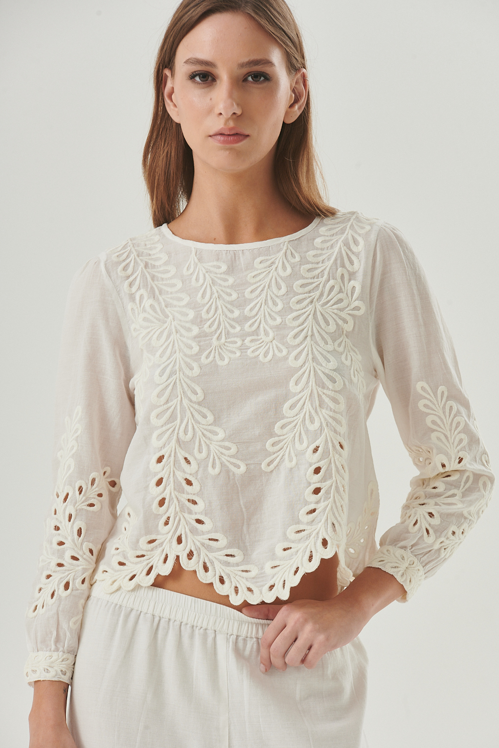 La Camisa Philum está confeccionada en algodón suave, con bordado floral a tono que aporta textura y delicadeza. Su calce relaxed y la caída fluida la hacen versátil para llevar suelta o fajada. Cuenta con cuello camisero clásico, cartera con botones y manga larga con puño abotonado. El bajo levemente redondeado le da un acabado prolijo y favorecedor. Ideal para sumar un toque femenino a tus looks de jeans, pantalones sastreros o faldas.