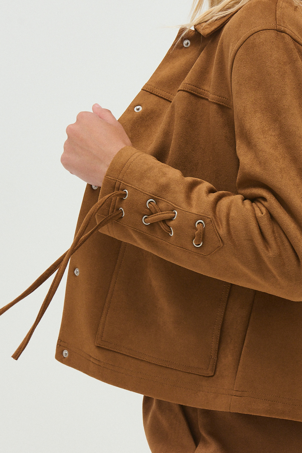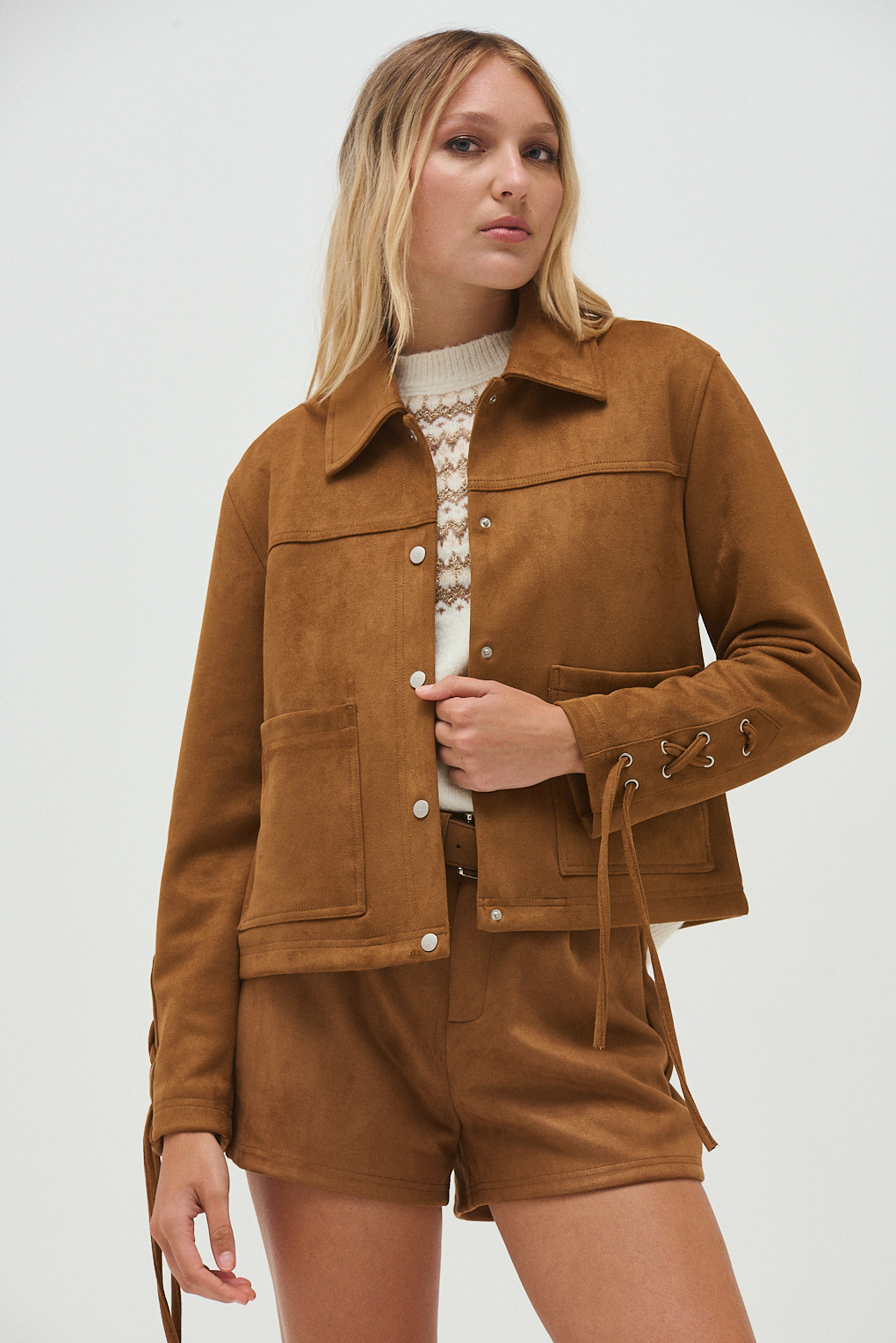 La Campera Sally está confeccionada en gamuza suave y cuenta con forro interno, ideal para sumar abrigo sin perder estilo. Su diseño combina un aire clásico con detalles modernos: cuello amplio, cierre frontal con broches metálicos, bolsillos delanteros aplicados y un calce relajado que la hace cómoda para el uso diario. Las mangas incorporan detalle de tiras ajustables, que aportan un toque distintivo y delicado. Es una prenda versátil, perfecta para looks urbanos de invierno, tanto con jeans como con pantalones más sastreros.