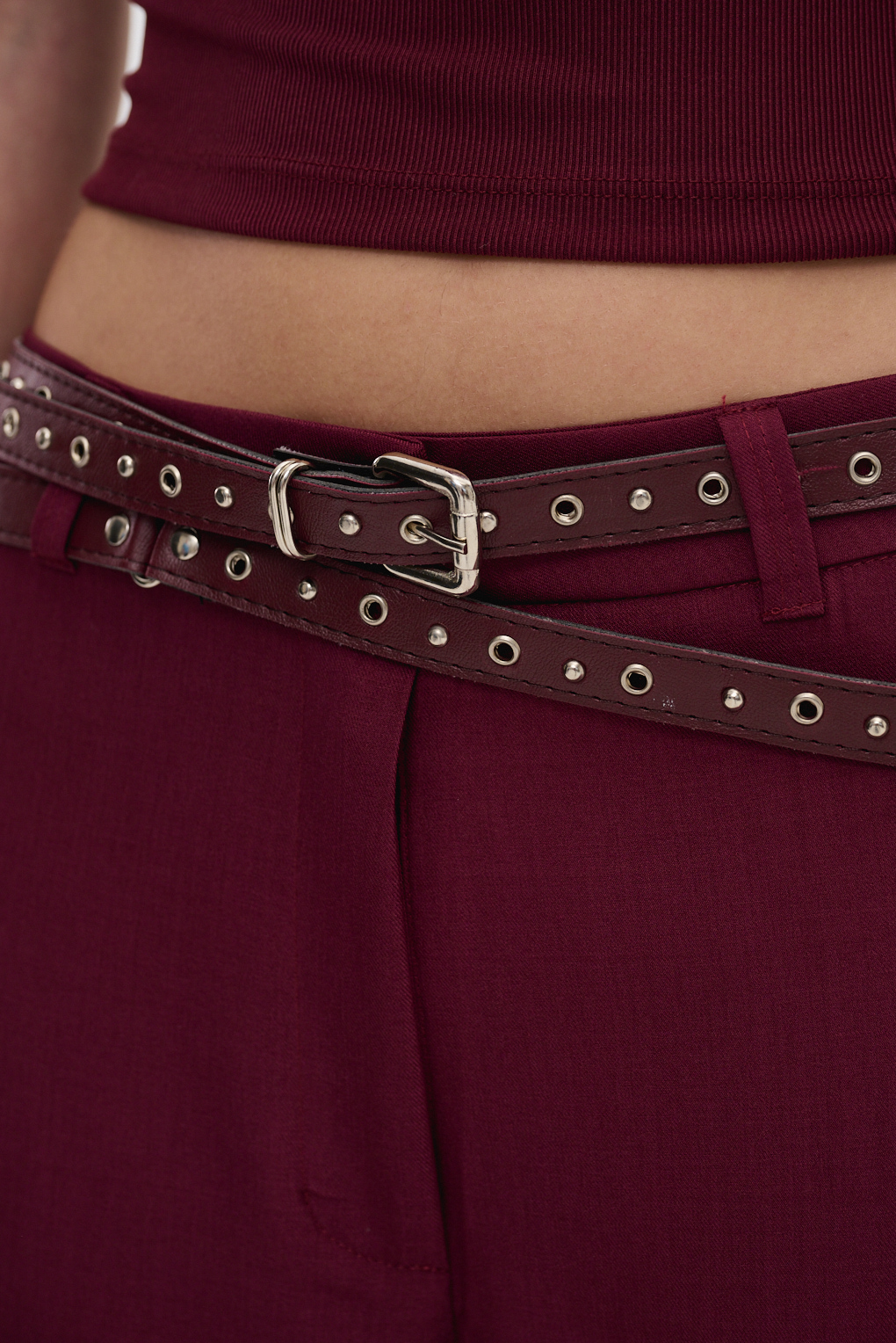Cinto confeccionado en eco-cuero, su doble largo te permite jugar con distintas formas de uso: cruzado, con vuelta o colgando para un estilo más relajado y moderno. Las tachas metálicas a lo largo del cinturón le aportan un aire chic que realza cualquier outfit, desde jeans hasta vestidos o blazers.
