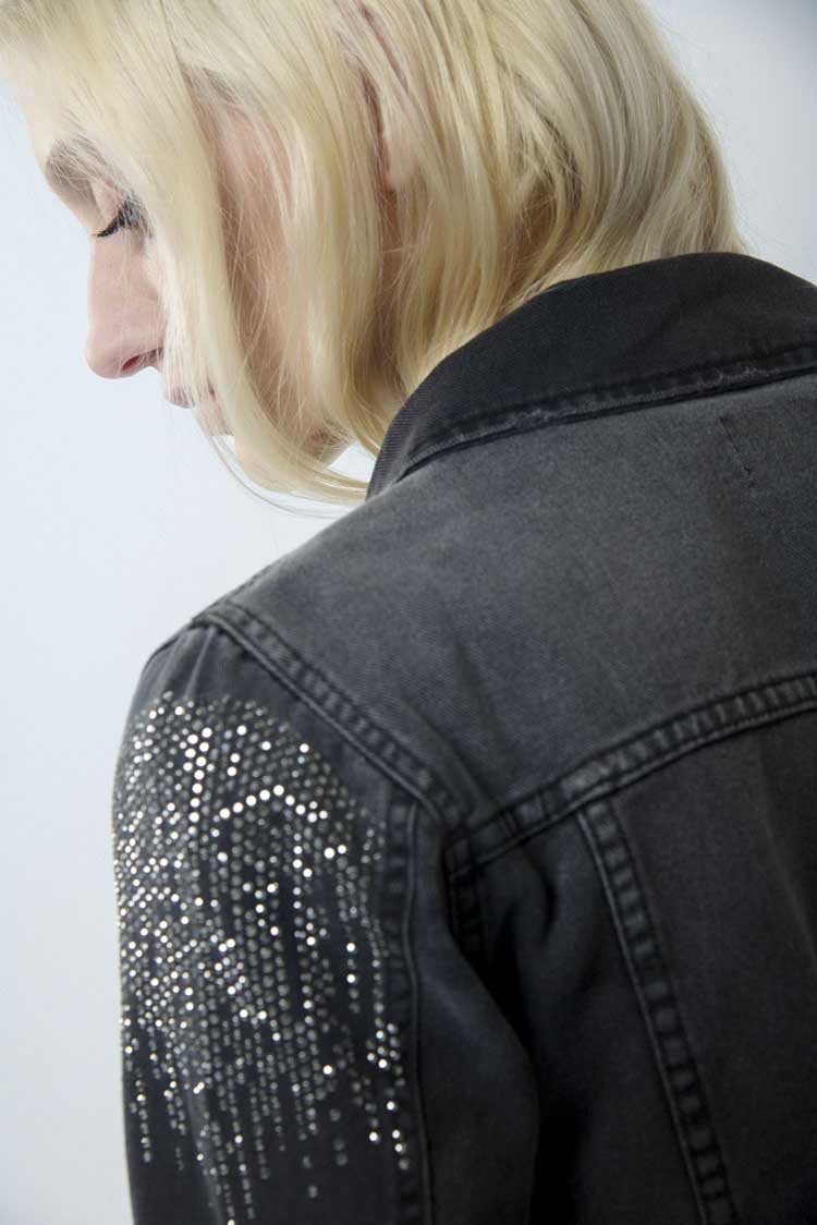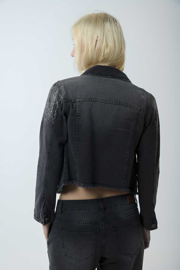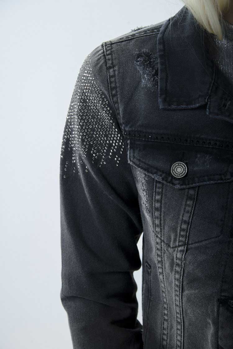 Campera de denim, rígida de tonalidad negra con touch de desgastado. Con bolsillos laterales y frontales con solapa. Con terminación desflecada. Tiene detalles de strass en hombros. Este modelo es un clásico que se renueva temporada tras temporada. Anímate a combinarlo con nuestra línea Denim para un total look. Textil: Denim.