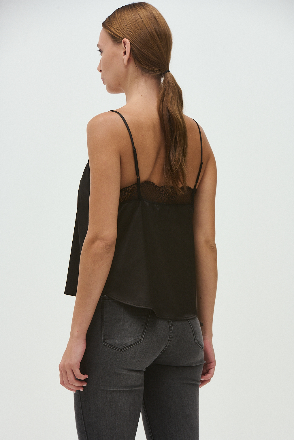 El Top Zadi está confeccionado en satén liviano y fluido, con un acabado suave que aporta brillo y movimiento. El escote en V está enmarcado con puntilla trabajada, que suma un toque romántico y femenino. Sus breteles finos regulables permiten un calce cómodo y adaptable.