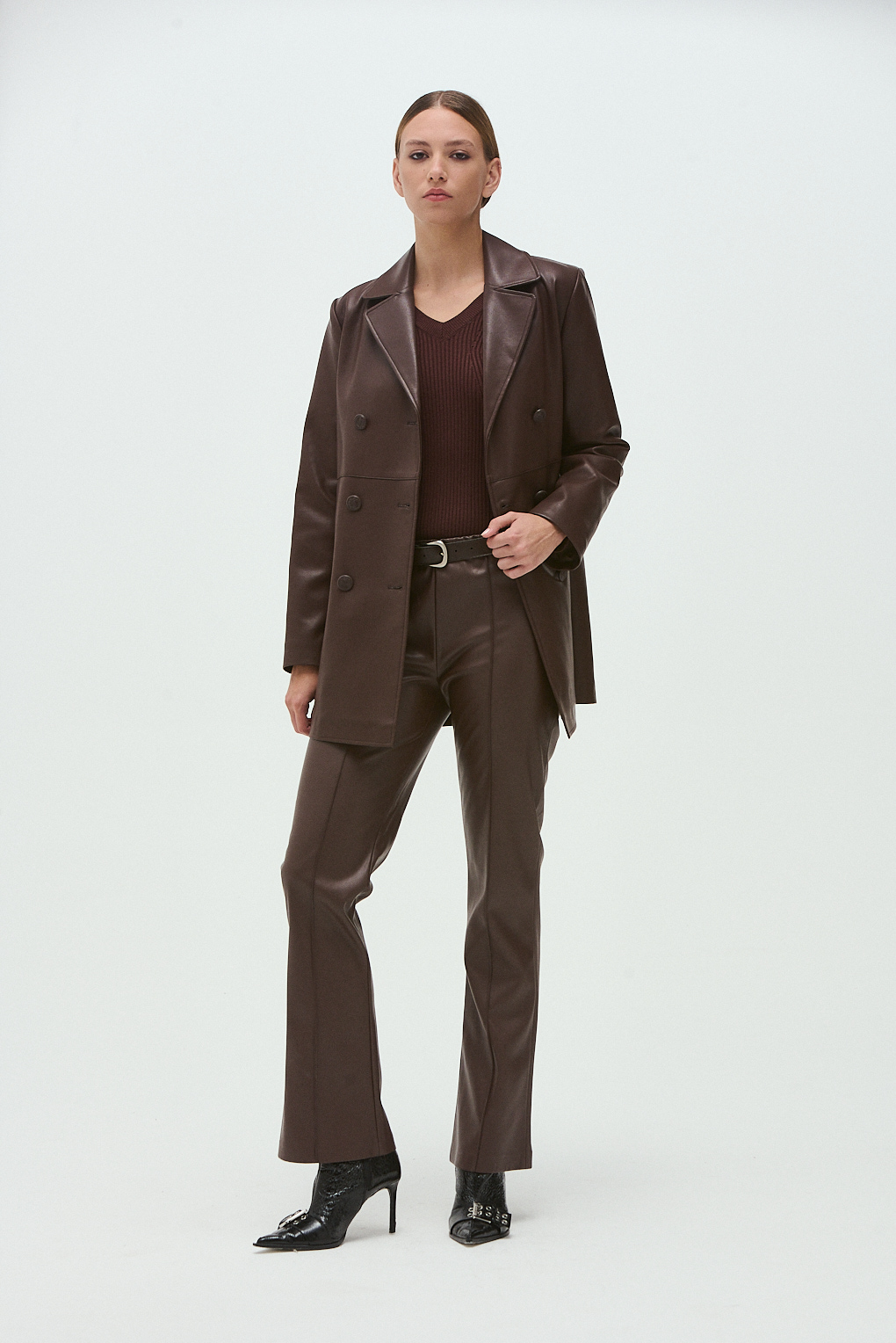 El Pantalón Jackie PU está confeccionado en material con acabado tipo cuero (PU), que aporta una estética moderna y un toque sofisticado al look. Su tiro medio ofrece un calce cómodo, mientras que el corte recto estiliza la silueta y facilita su combinación con distintos estilos. La cintura elastizada suma confort y practicidad, convirtiéndolo en una prenda ideal para usar durante todo el día.