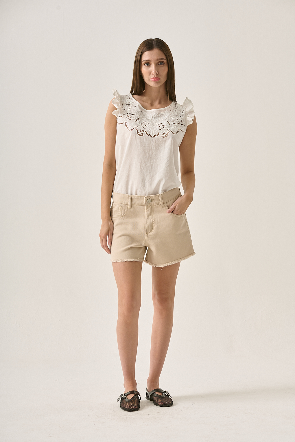 La remera Cassie está confeccionada en microfibra suave y elastizada, brindando un calce cómodo y al cuerpo. Su diseño sin mangas, con hombros marcados y cuello redondo, crea una silueta moderna y favorecedora. Es una prenda versátil que se adapta tanto a looks urbanos como más arreglados, ideal para el verano.