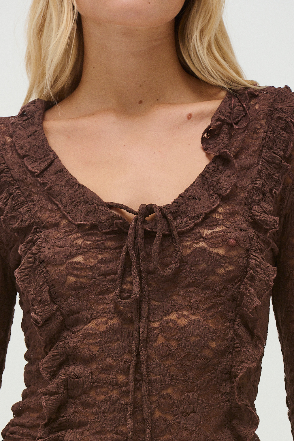 La Remera Ellen Flowed está confeccionada en encaje, una tela delicada que aporta textura y un look femenino. Su diseño se destaca por el escote en V con volados, que suma movimiento y realza el frente de la prenda. Las mangas largas cuentan con tiras ajustables en las muñecas, permitiendo regular el calce y aportar un detalle distintivo. Es ideal para looks más arreglados o para elevar un outfit diario, combinándola con jeans, pantalones sastreros o faldas.