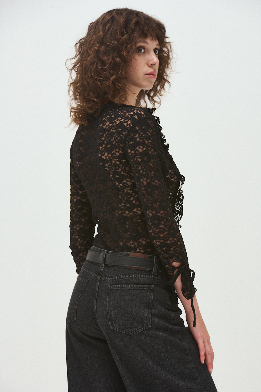 La Remera Ellen Flowed está confeccionada en encaje, una tela delicada que aporta textura y un look femenino. Su diseño se destaca por el escote en V con volados, que suma movimiento y realza el frente de la prenda. Las mangas largas cuentan con tiras ajustables en las muñecas, permitiendo regular el calce y aportar un detalle distintivo. Es ideal para looks más arreglados o para elevar un outfit diario, combinándola con jeans, pantalones sastreros o faldas.