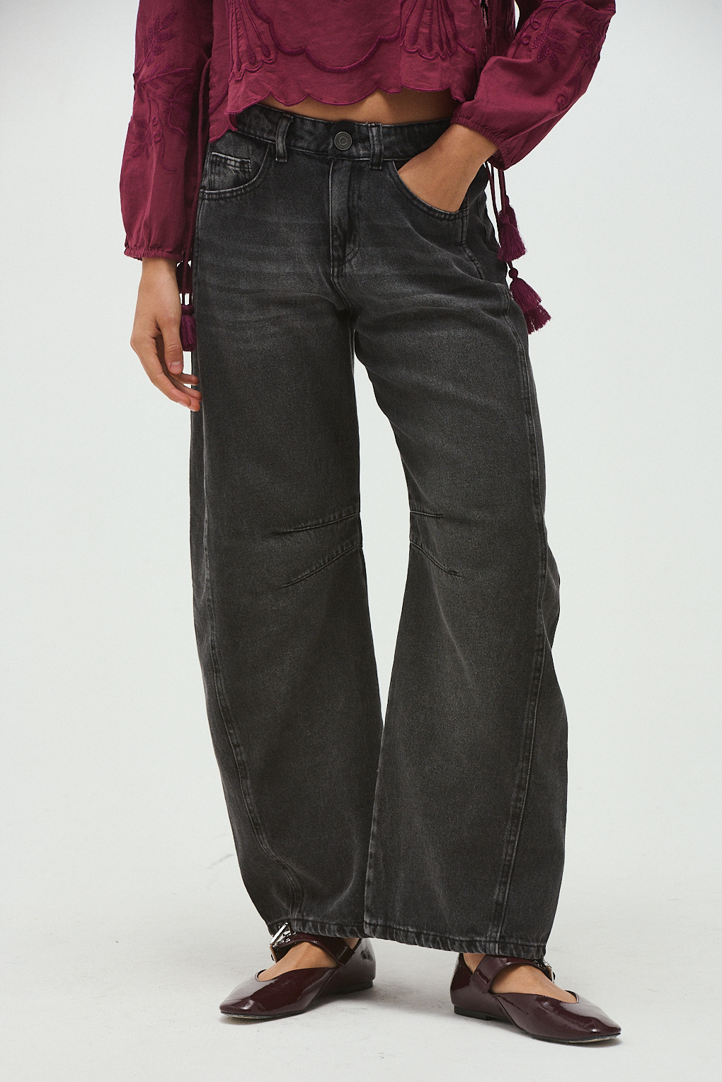 El jean Barrel Black es una apuesta segura si buscás sumar un toque canchero y moderno a tus looks. Su diseño de piernas amplias, con estructura tipo barrel, genera una silueta relajada y con mucha personalidad. Está confeccionado en denim rígido, con un tiro alto súper sentador y detalles de costura en las piernas que realzan el diseño. Ideal para usar con tops ajustados o camisas oversize.