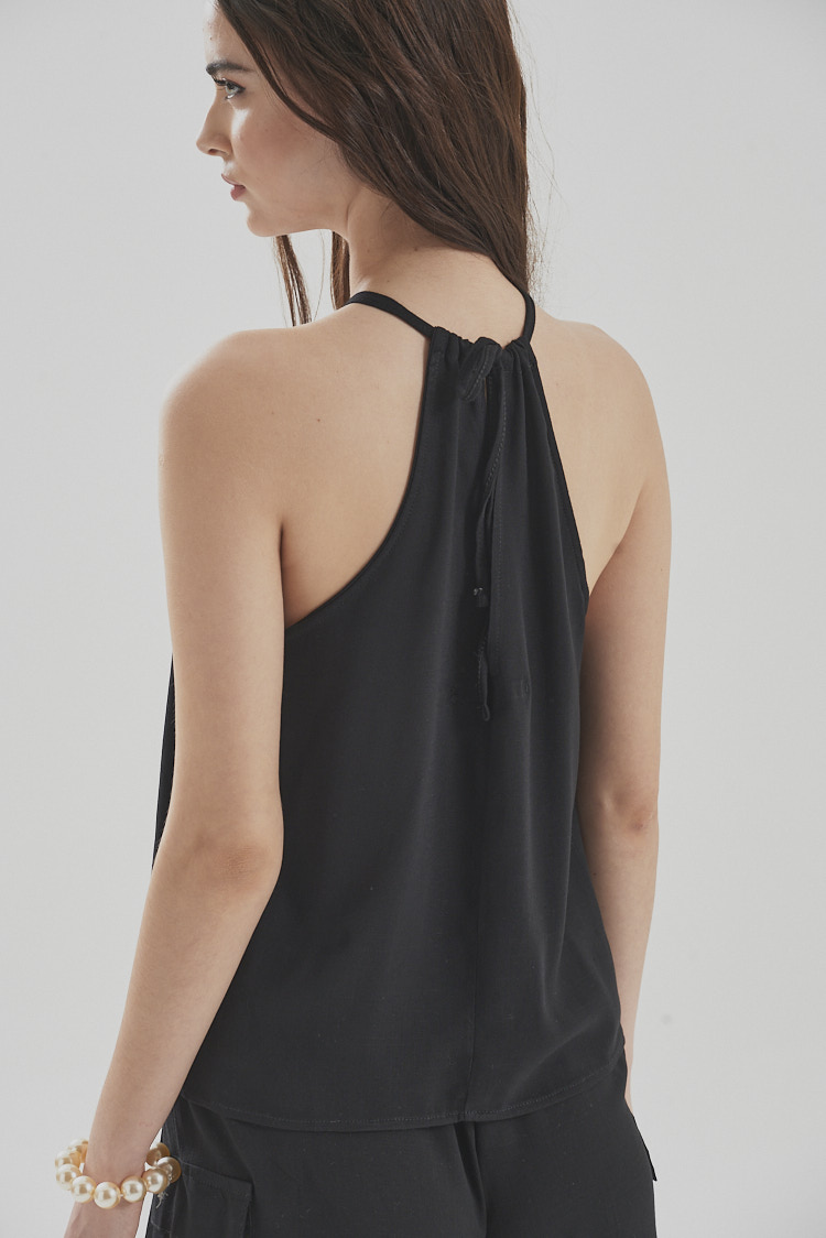 Top cuello halter con tiras para atar detrás del cuello. Con sisa cavada, tiene un largo modular por debajo de la cintura. Es una prenda básica pero con detalles que la hacen distinta dentro de su categoría.