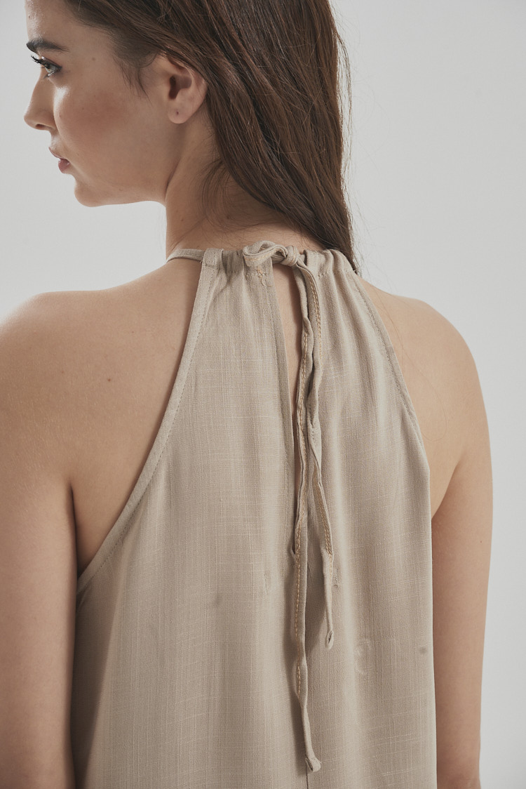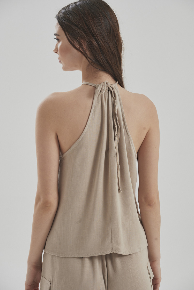 Top cuello halter con tiras para atar detrás del cuello. Con sisa cavada, tiene un largo modular por debajo de la cintura. Es una prenda básica pero con detalles que la hacen distinta dentro de su categoría.